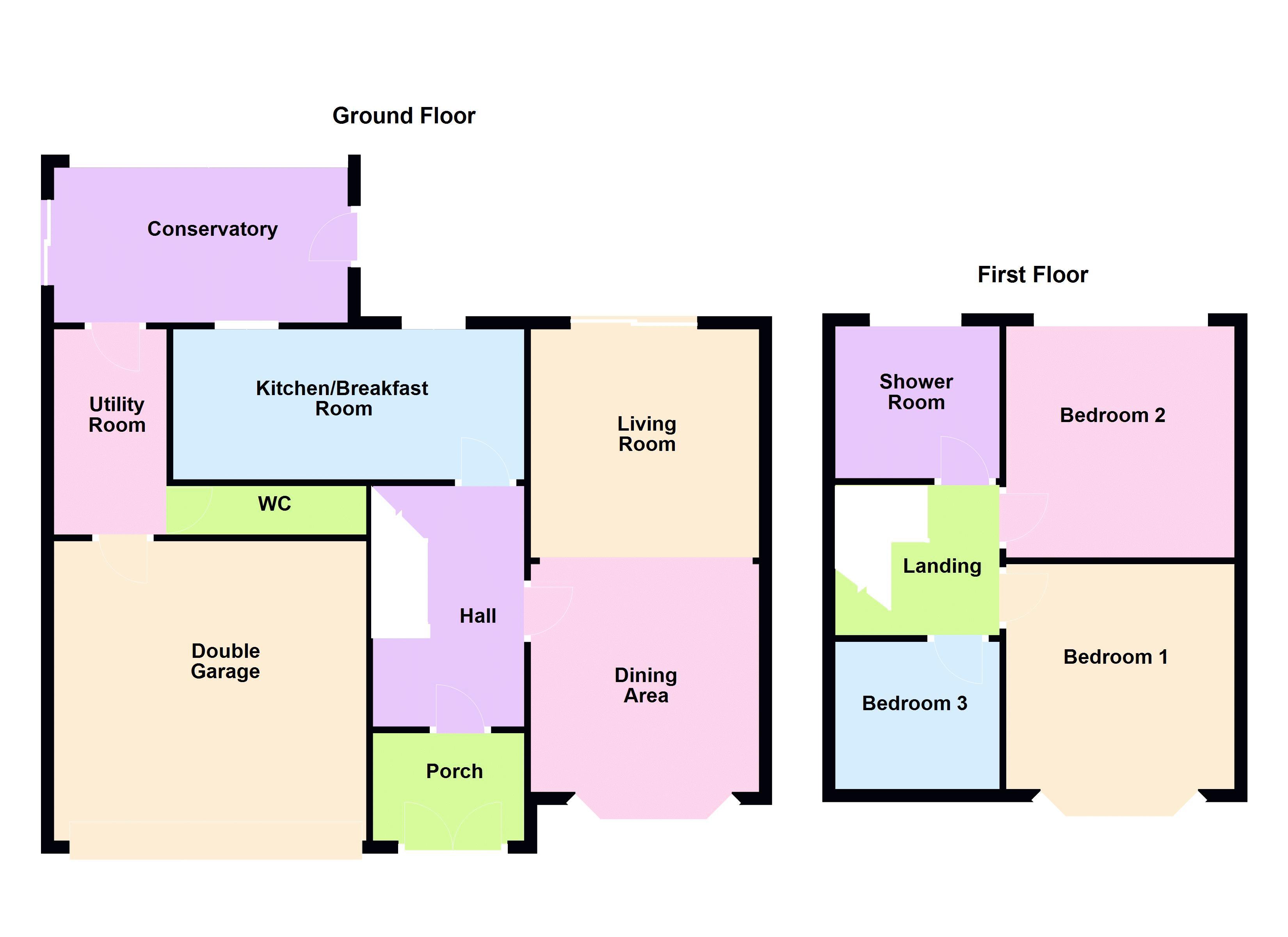Fully Enclosed Porch leading into Reception Hall with stairs to first floor off and doors to Through Lounge/Dining Room: Dining Area 3.6m x 3.6m with bay window to front, Lounge 3.6m x 3.6m with double glazed patio doors overlooking rear garden. Extended Breakfast Kitchen 5.5m x 2.3m with range of units, door leads to Utility Room with access to Conservatory 4.7m x 2.4m.