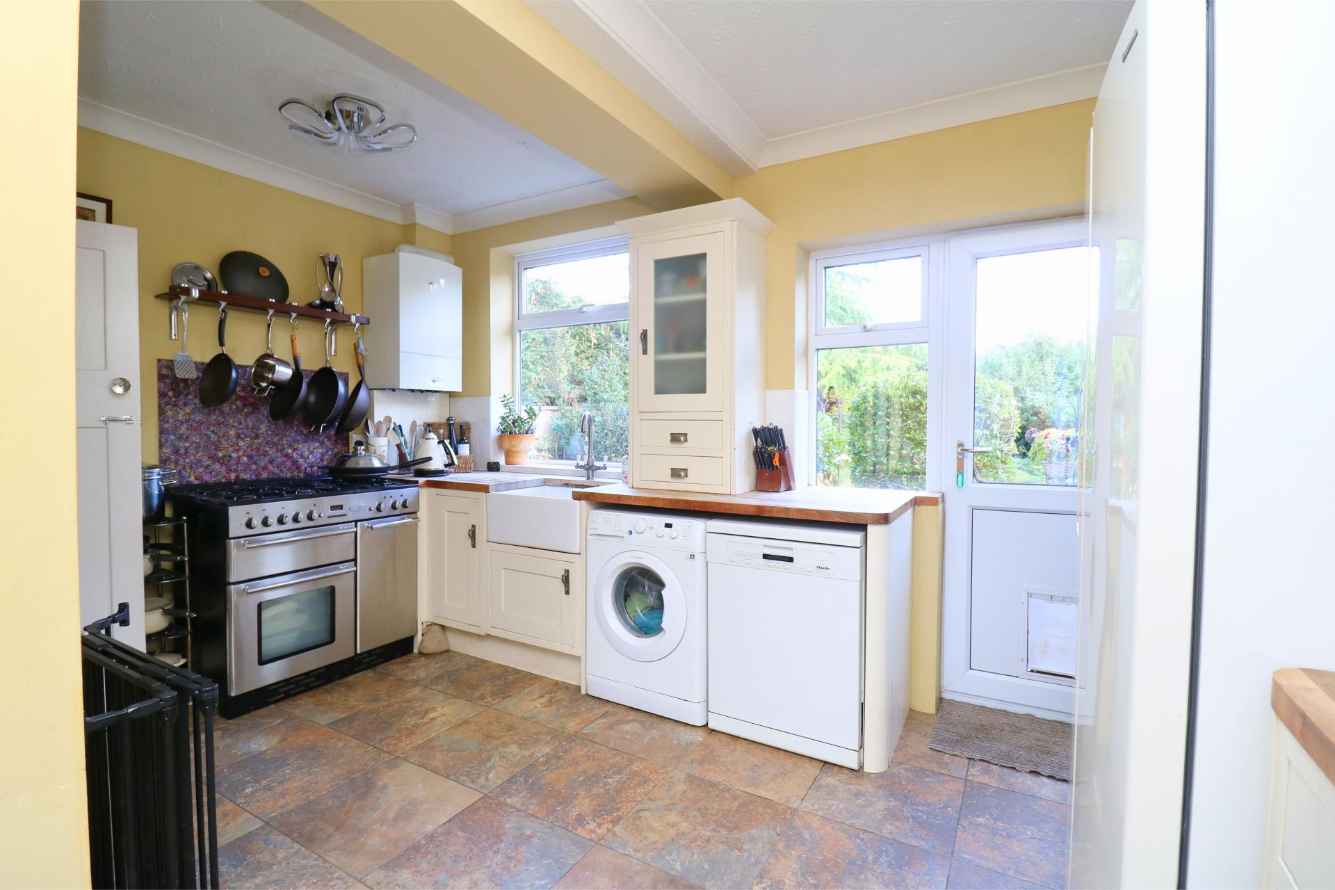 Having a range of wall and base cupboard units, Belfast sink with mixer tap over, plumbing for washing machine, space and plumbing for dishwasher and tumble dryer, wooden work surfaces, part tiled walls, double glazed windows to rear elevation, ceiling coving, two ceiling light points, deep under storage cupboard and door leading to outside.