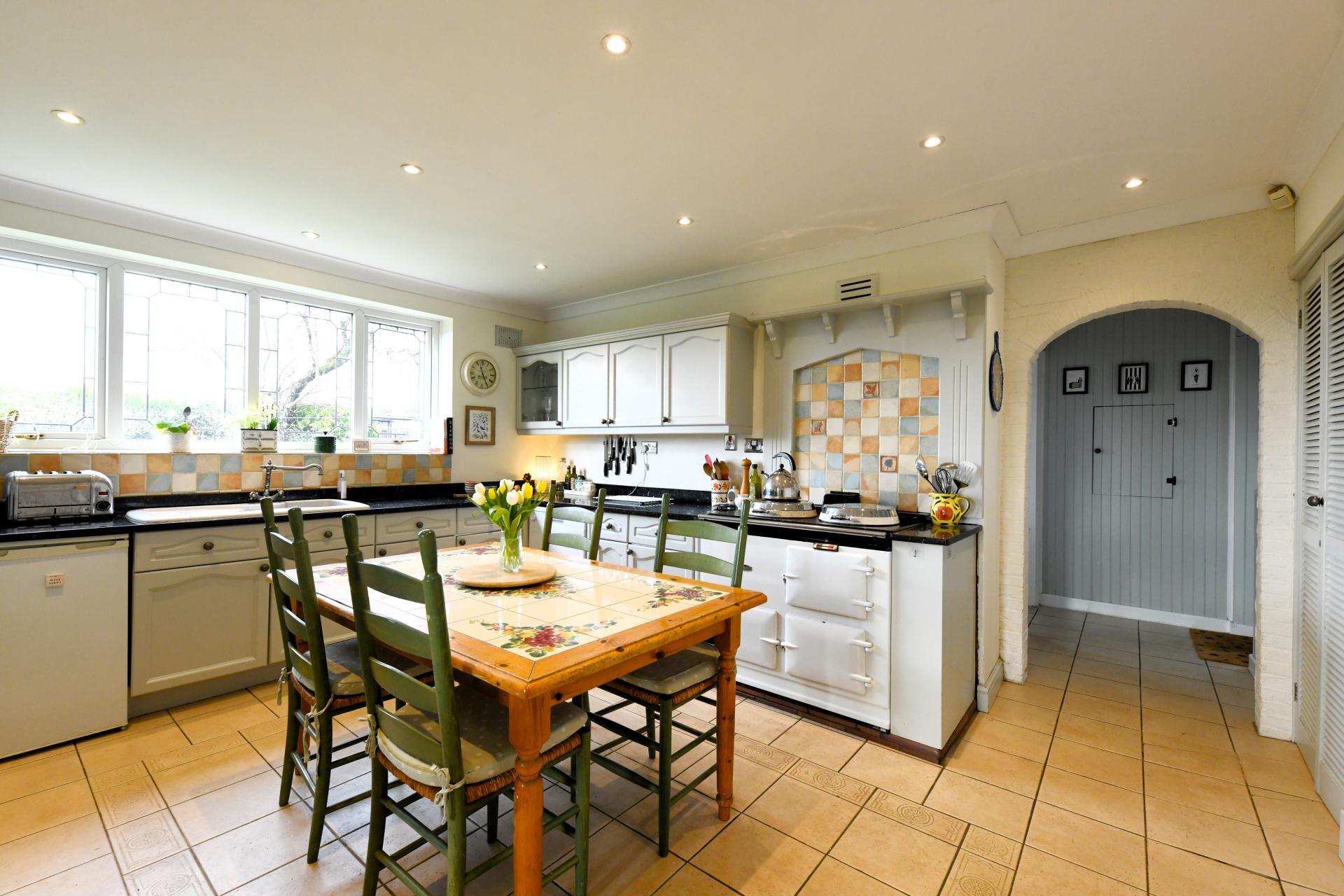 Having a range of pale farmhouse style wall and floor units with dark granite work surfaces over, Aga, window to side, walk in cupboard and access to