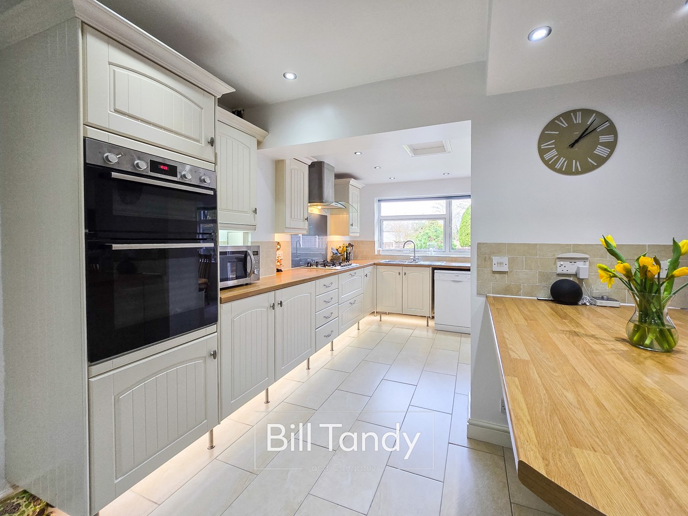 4.54m x 1.98m (14' 11" x 6' 6") having double glazed window and door to rear garden, tiled flooring, door to double garage, radiator, tiled floor, spotlighting to ceiling, cream Shaker style cupboards with round edge preparation work tops above, wall mounted cupboards, space for fridge/freezer and washing machine, separate loft access and door to: