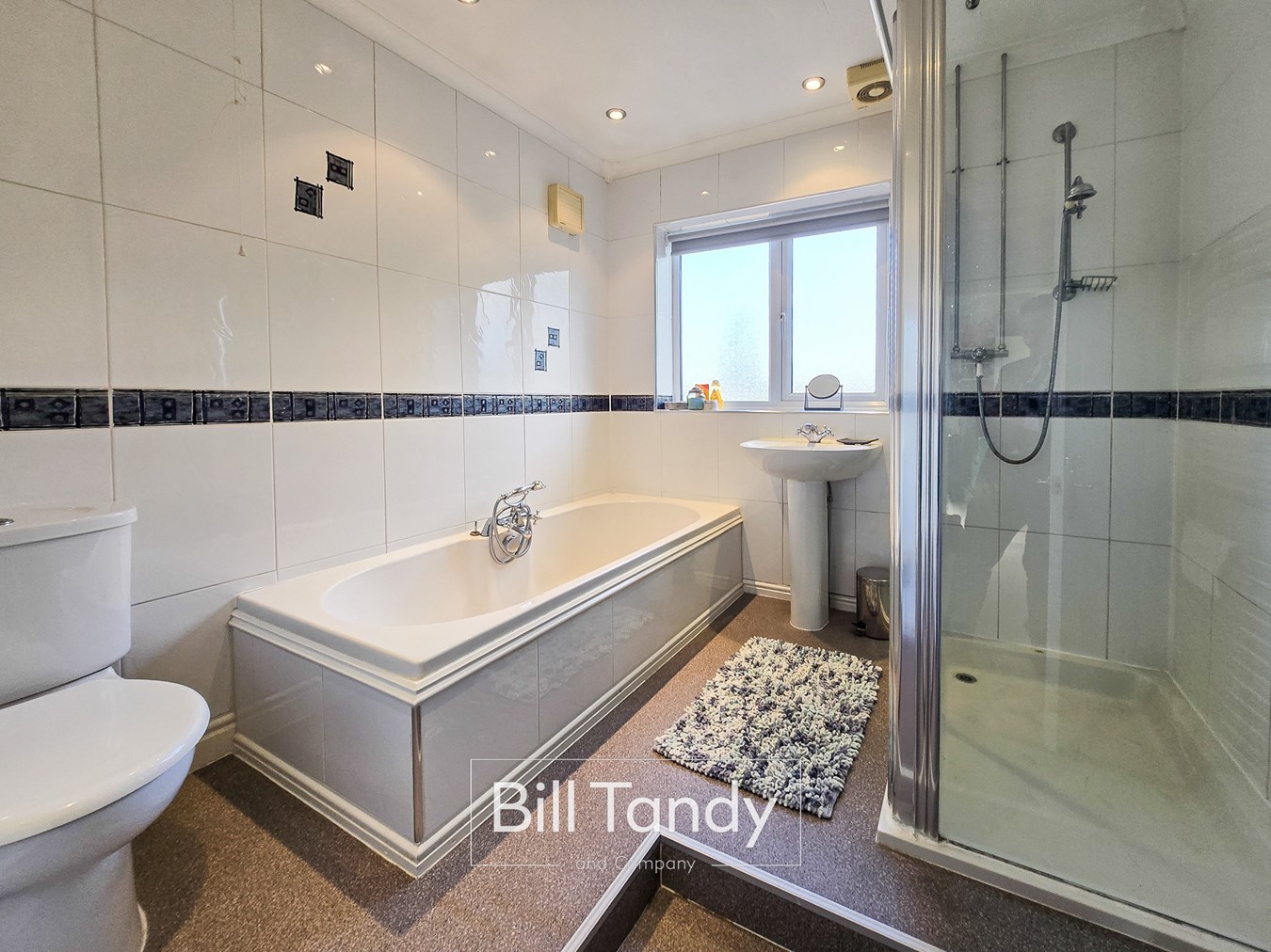 2.61m x 2.40m (8' 7" x 7' 10") superbly modernised and updated having modern white suite comprising pedestal wash hand basin with tiled surround, low flush W.C. and twin-ended bath with shower head attachment and shower enclosure with shower appliance over and spotlighting to ceiling, chrome heated towel rail and radiator.