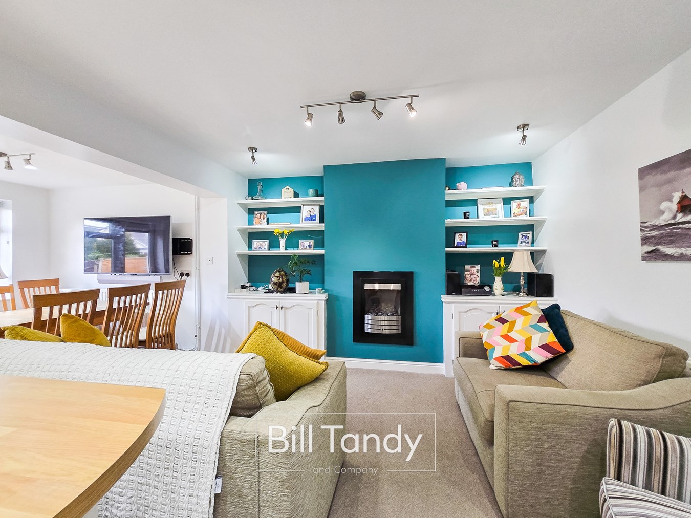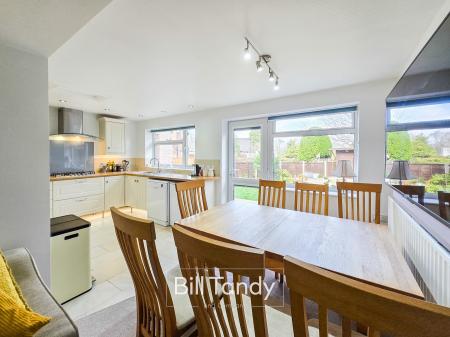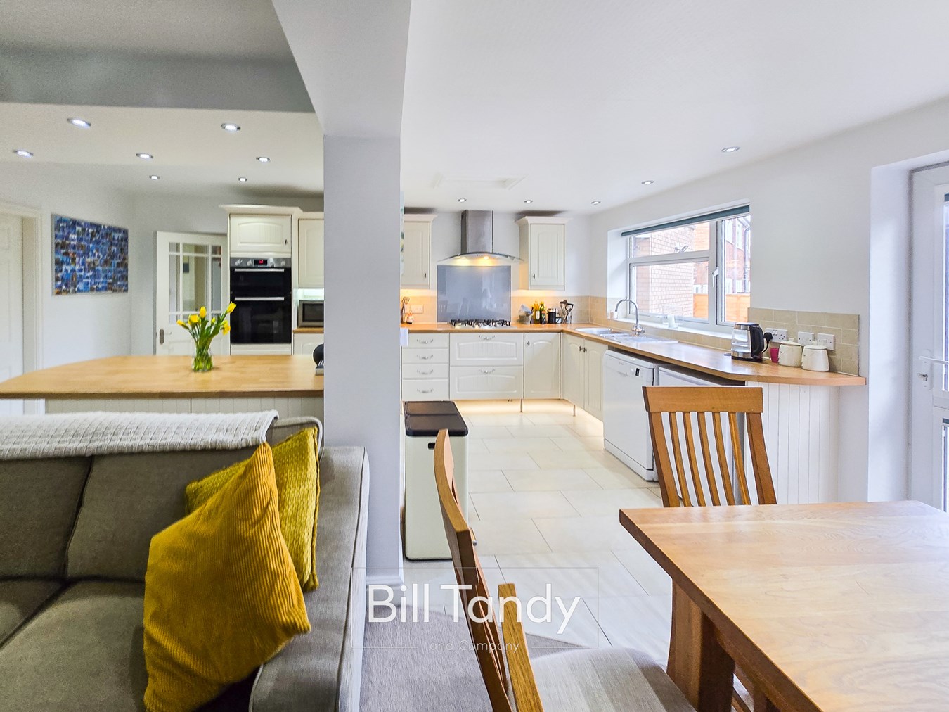 6.39m max x 5.48m max (21' 0" max x 18' 0" max) having been extended and offering both a sitting area, dining area and updated kitchen. The sitting area has useful base storage, wall mounted contemporary gas fire, radiator and opens into the dining area having double glazed window and door to rear, radiator and provision for a wall mounted T.V. The kitchen has been superbly improved with a range of cream Shaker style kitchen units with under-unit lighting, round edge work tops, tiled splashback surround, inset stainless one and a half bowl sink with drainer, wall mounted units with under-unit lighting, inset five ring gas hob with glass splashback surround and extractor fan above, inset Bosch double oven and grill, spaces for white goods, spotlighting to ceiling and breakfast bar area.
