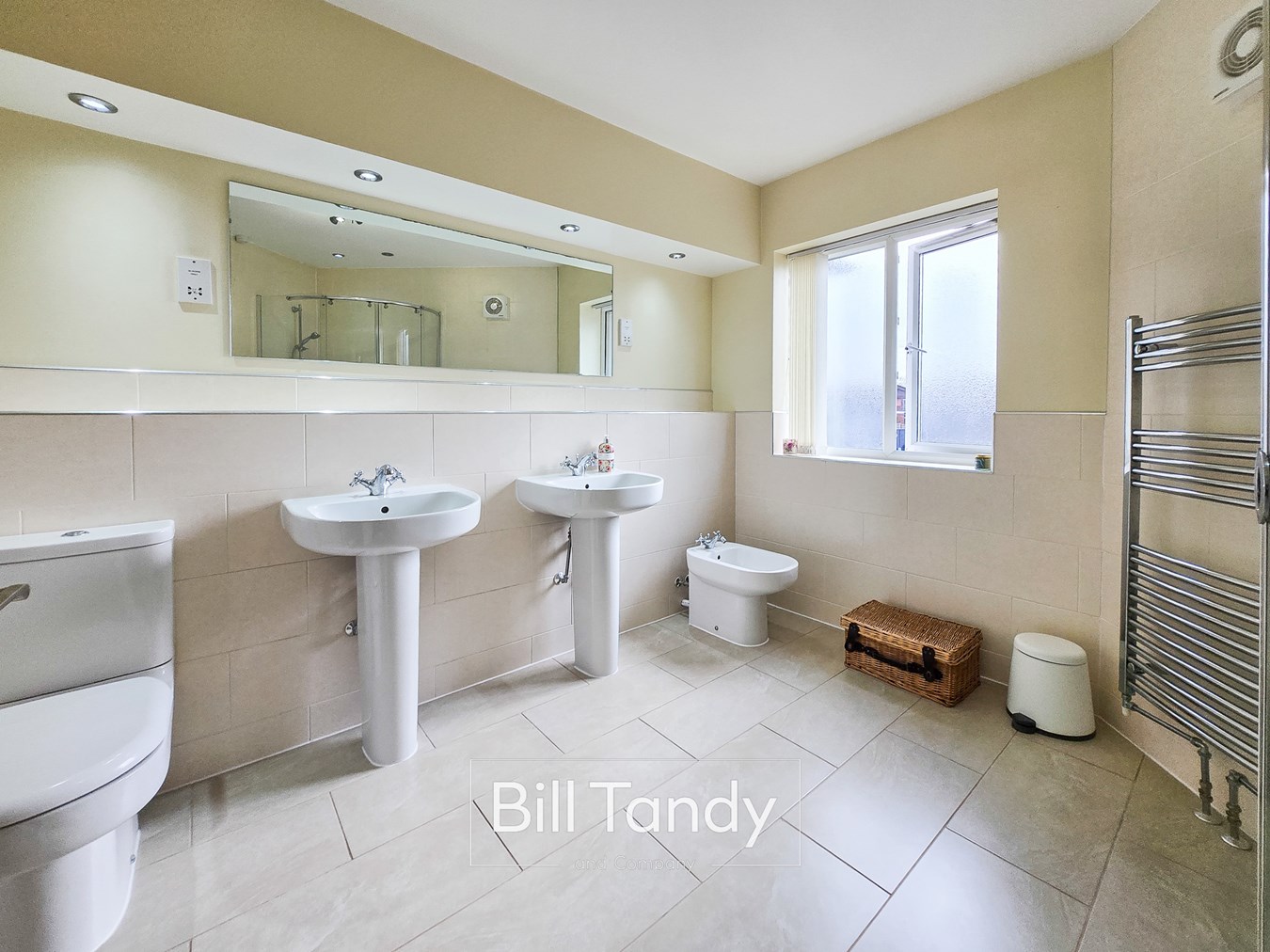 3.68m max x 3.19m max (12' 1" max x 10' 6" max) having an obscure double glazed window to front, two chrome heated towel rails, contemporary white suite comprising two wash hand basins, low flush W.C., bidet and shower cubicle with shower appliance over, tiled surround, and tiled flooring,