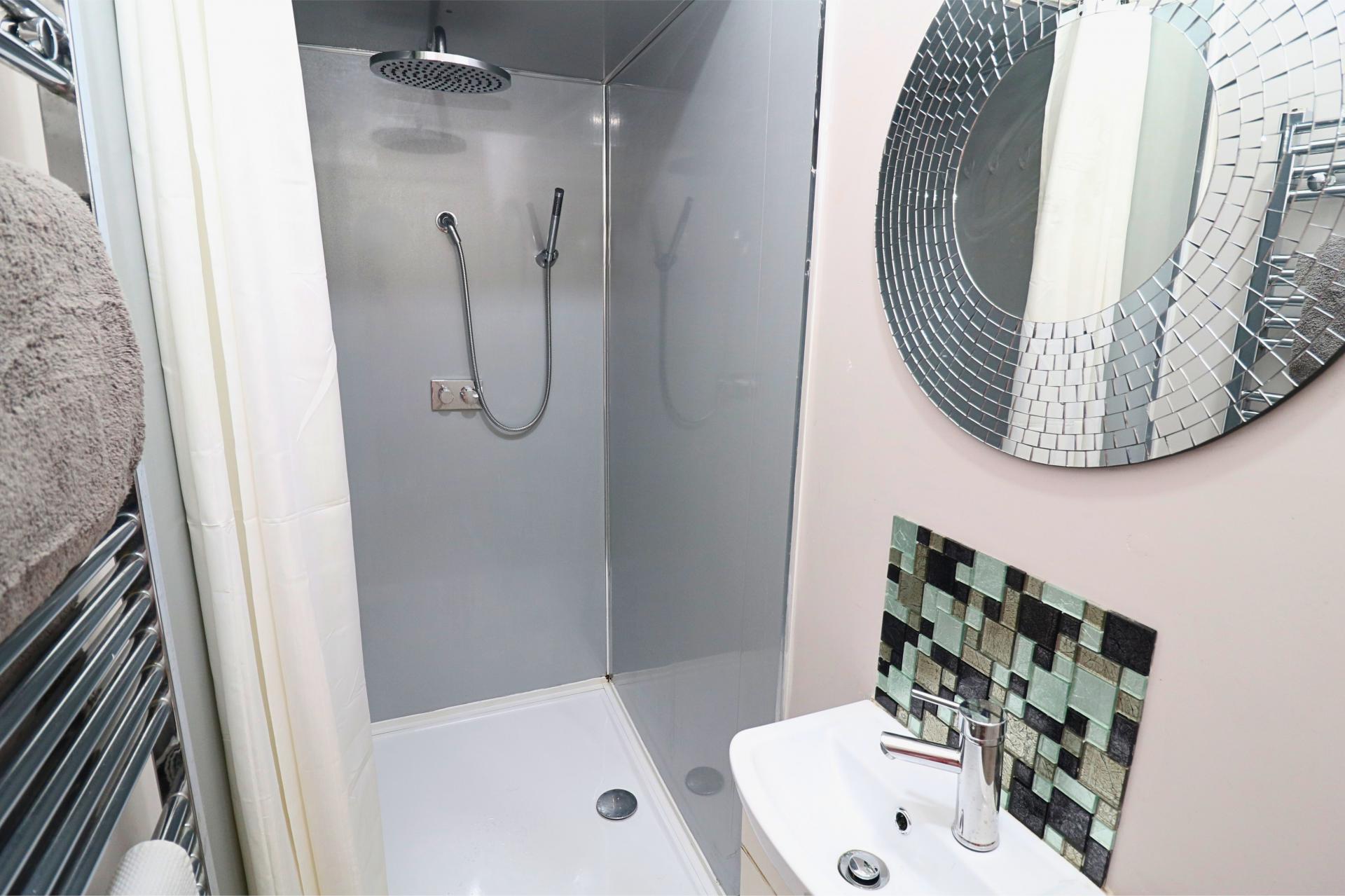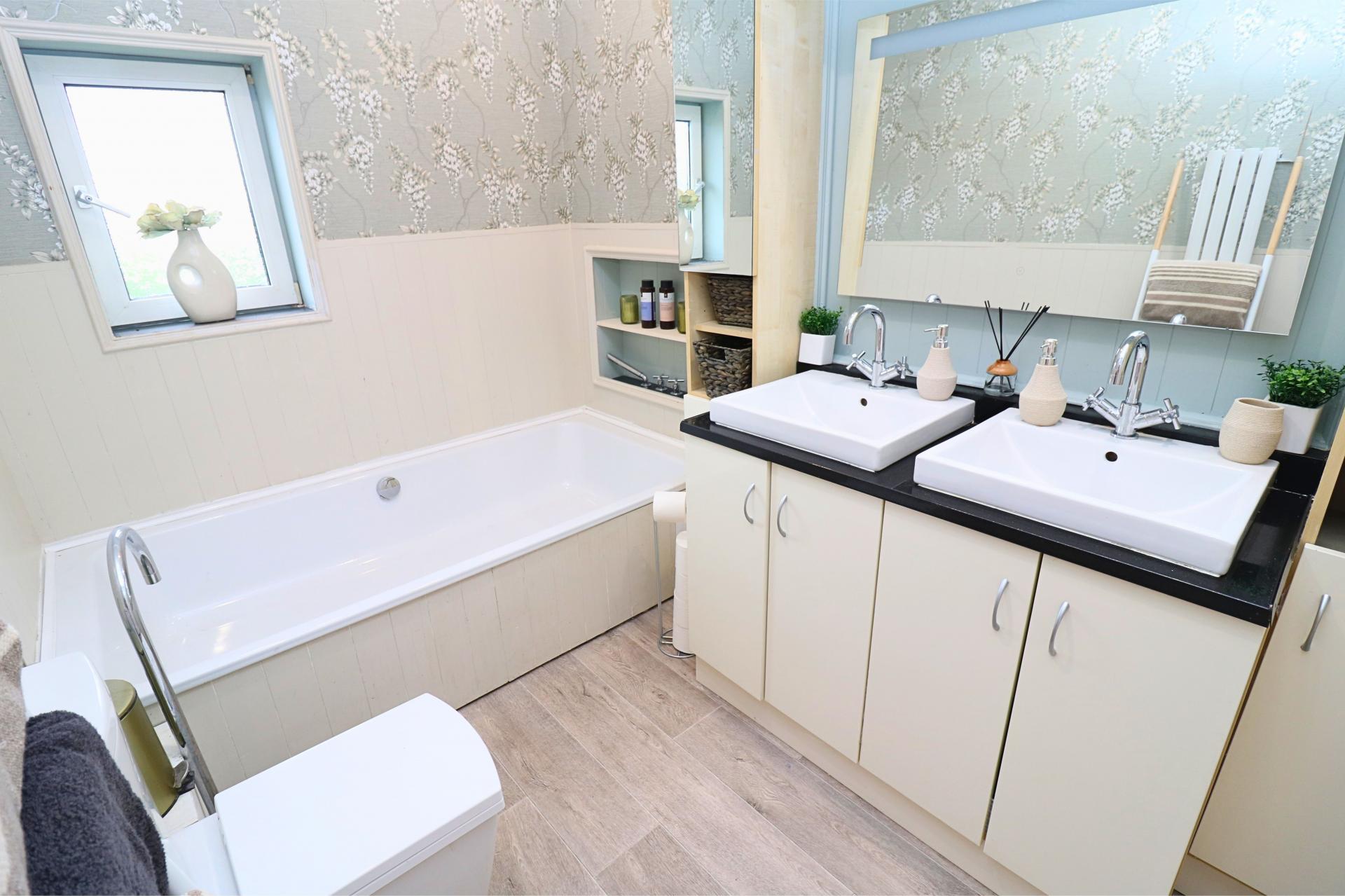 - Contemporary family bathroom with separate shower room