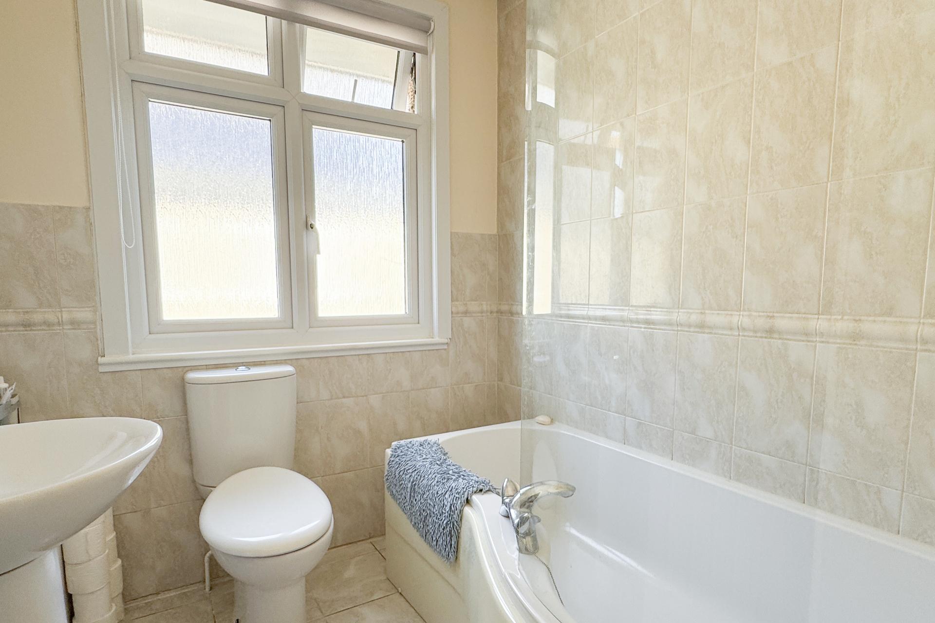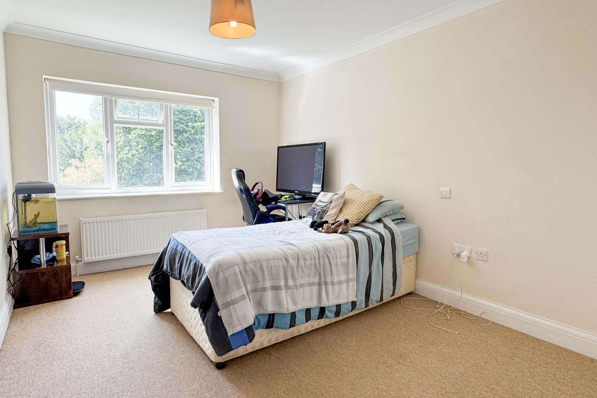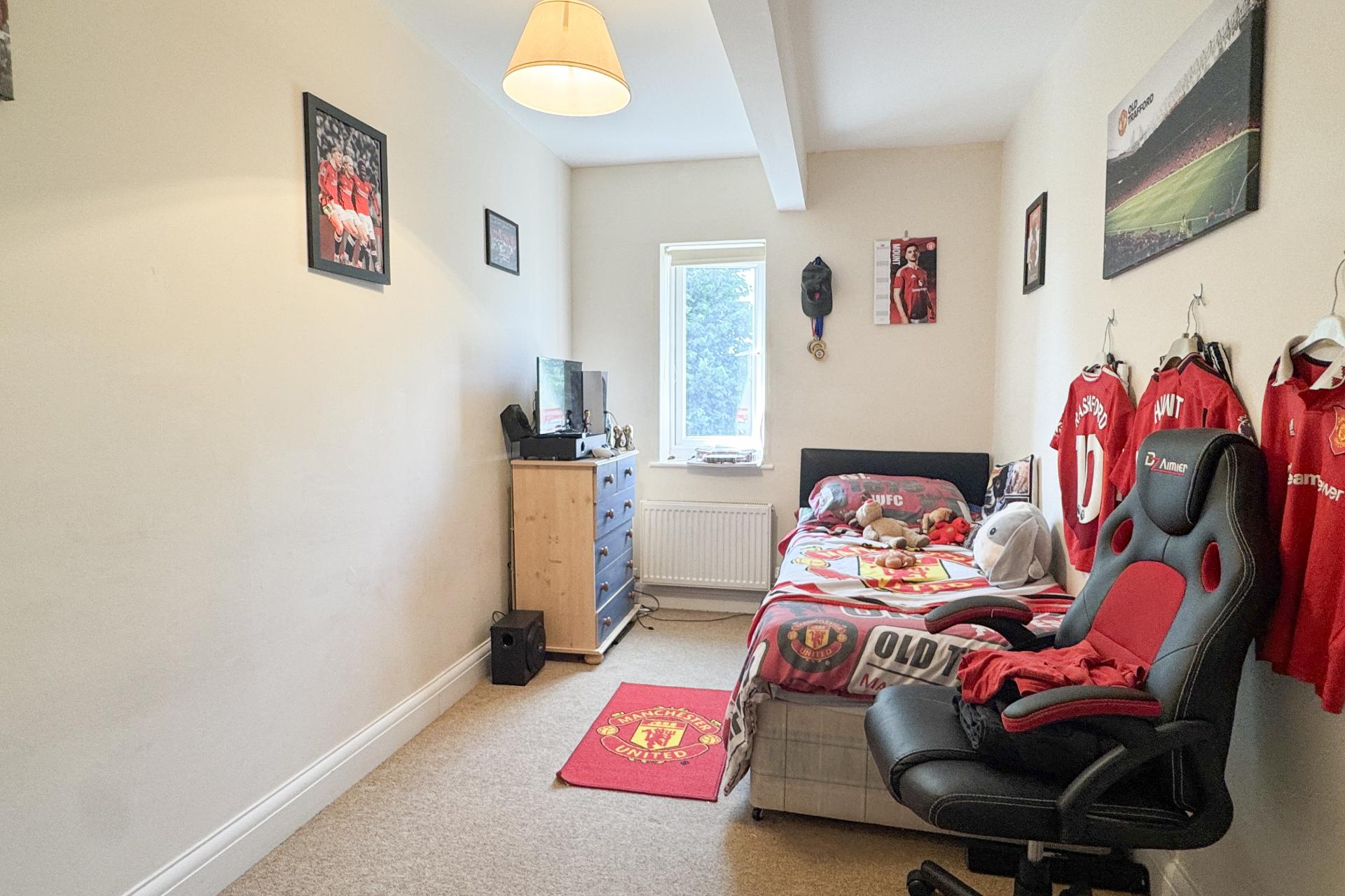 The first floor is arranged around a central landing. The principal bedroom is a generous double, complete with built-in wardrobes and a private en suite. The second bedroom also enjoys en suite facilities, while two further bedrooms are well-proportioned and filled with natural light. A modern family bathroom serves the remaining rooms.