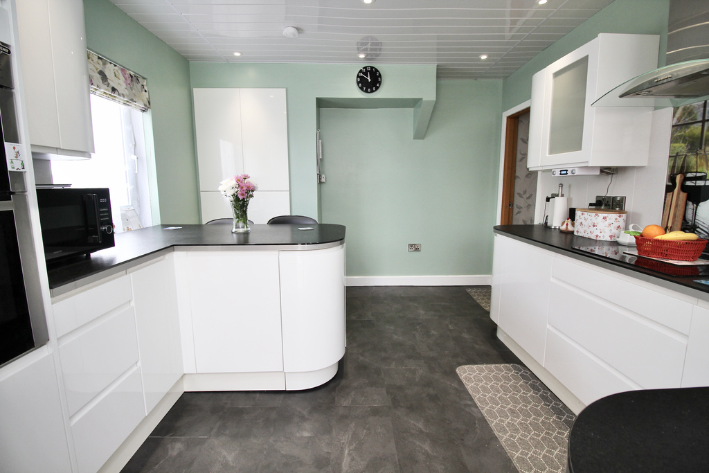 - Stylish modern kitchen with sleek wall, base and drawer units, integrated oven, hob and fridge, complemented by a breakfast bar and ample workspace.