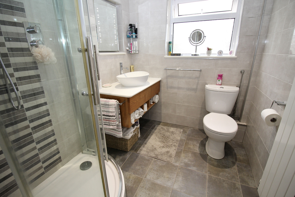 - Stylish shower room featuring a corner shower enclosure, vanity unit with countertop basin and WC, complemented by modern wall and floor tiling.
