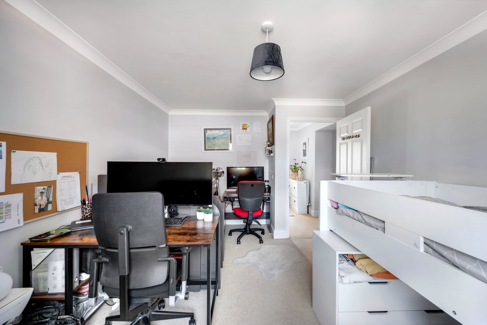 Inside, the maisonette features a thoughtfully designed layout with a separate kitchen and lounge, allowing for distinct living and dining areas. The kitchen is well-equipped with modern fittings, while the lounge provides a bright and airy space for relaxation and entertaining. Each of the two bedrooms offers comfortable proportions and natural light, making them suitable for both sleeping and home office use.