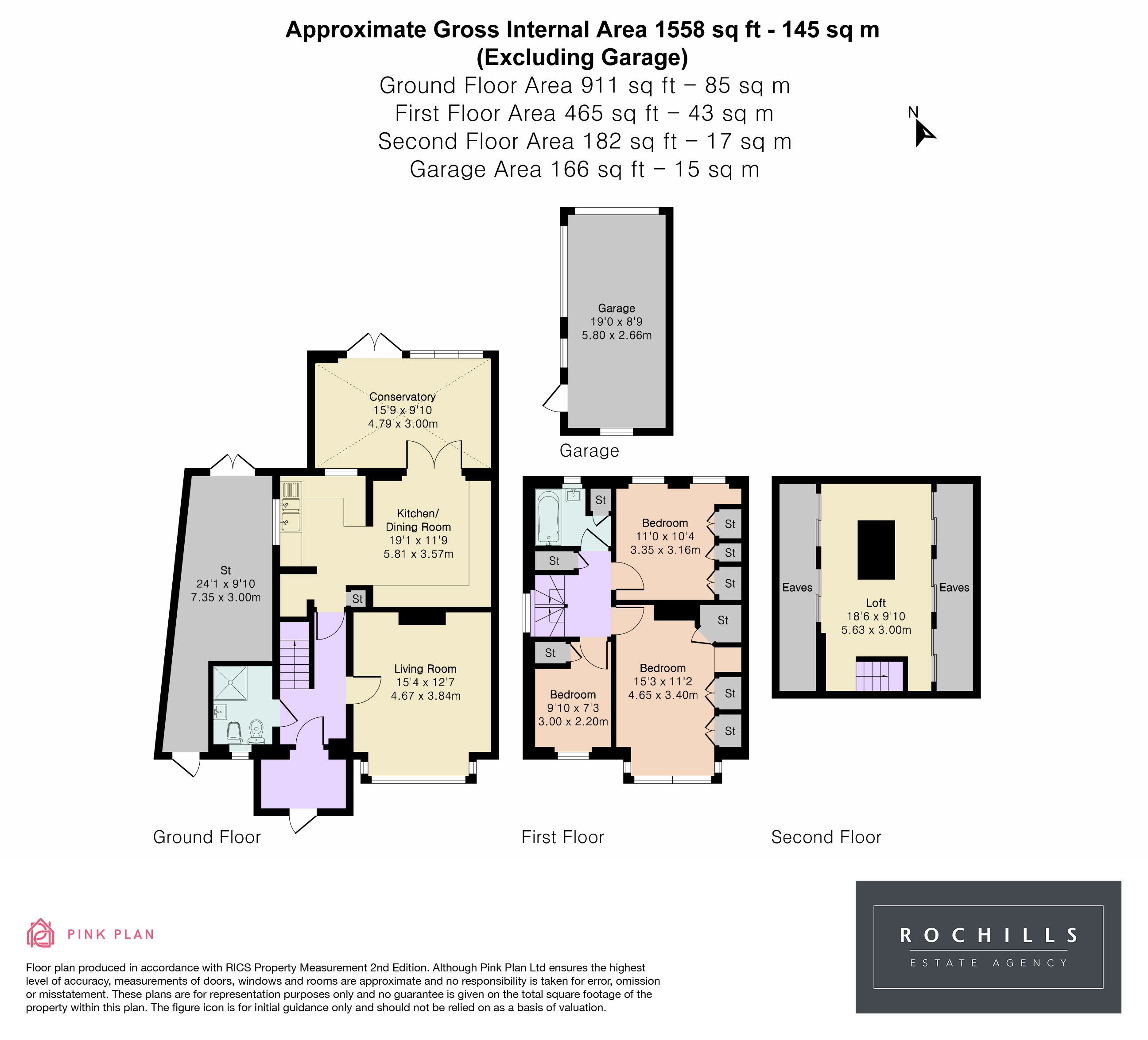 The generous rear garden offers scope for landscaping and improvement, with lawn and patio potential, and further benefits from a large detached garage providing secure parking or additional storage. The garage also has a fitted toilet and sink and outside has electric plugs and a hot and cold water tap. Upstairs features two well-sized double bedrooms, a third single bedroom, and access to a useful loft room ideal for storage or hobby space.
