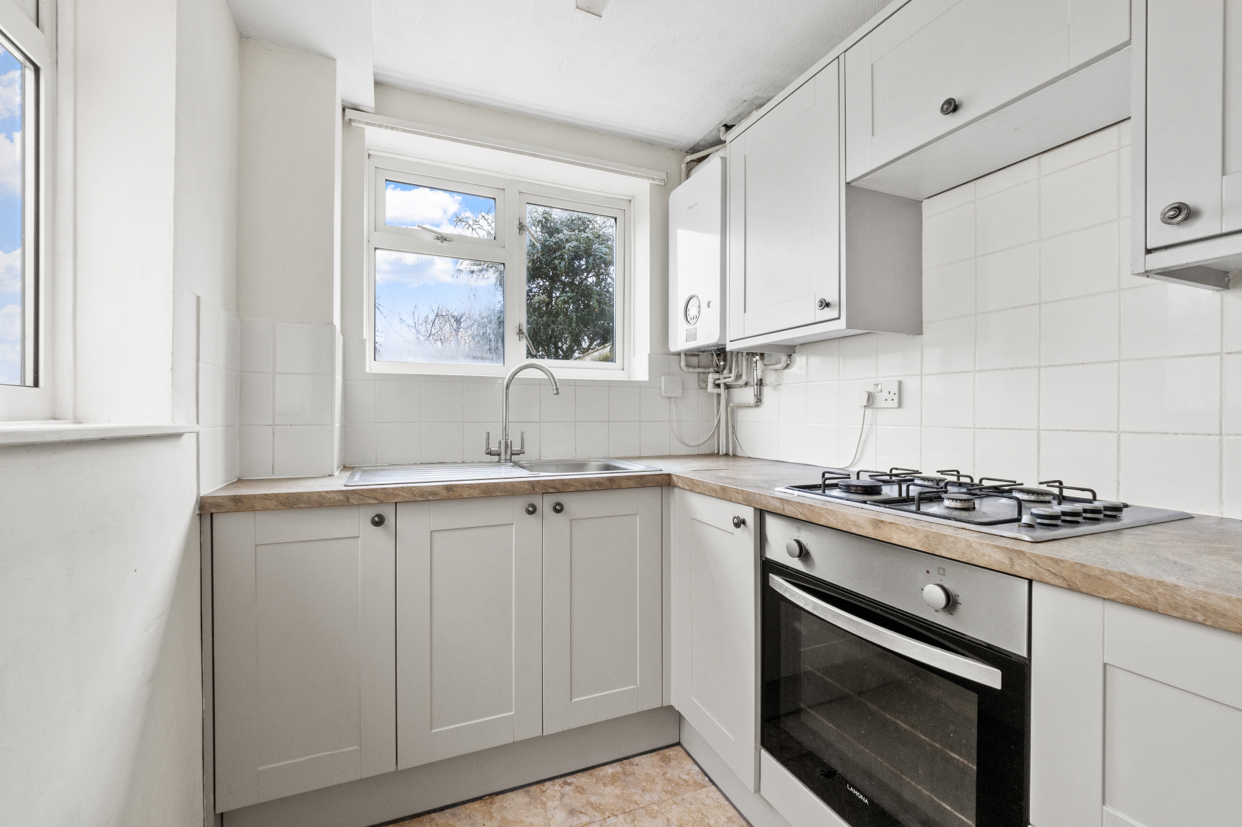 Onto the KITCHEN, which was added on (along with the bathroom above it) in the 1950's, now has modern wall and base units, a fitted gas hob, electric oven and space for a fridge freezer. The boiler is housed here and the outlook is onto the pretty garden at the rear.