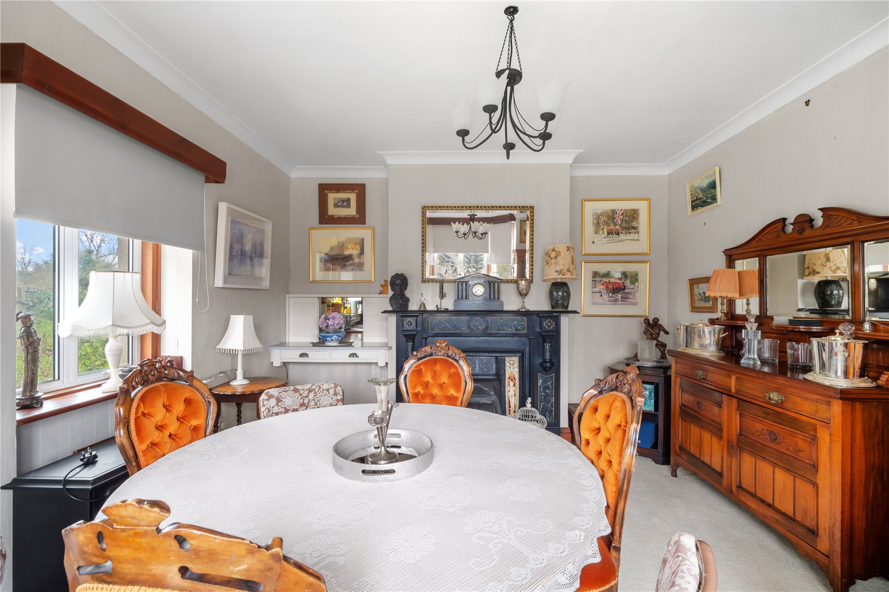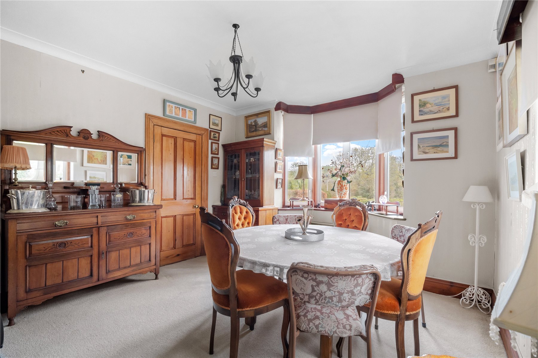 The DINING ROOM, across the hall from the sitting room, has views out to the front garden. There is a small serving hatch through to the kitchen - a nod to bygone times.