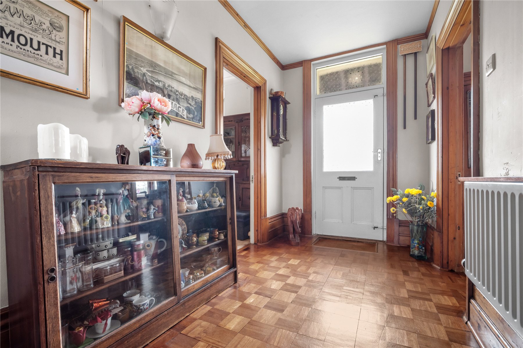 The welcoming HALLWAY, invites you to step into a piece of history, where period features are preserved. Original parquet flooring is laid in the hallway, there are high ceilings, bow windows and delightfully decorated fireplaces.