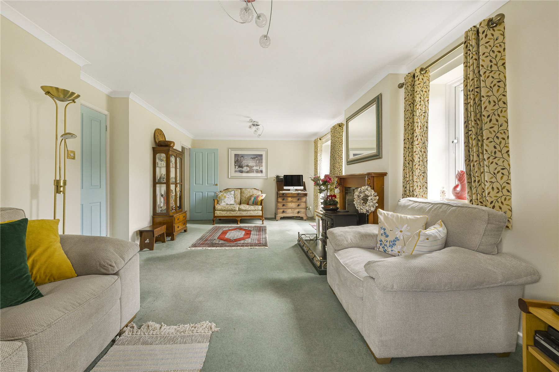 The SITTING ROOM runs the width of the house, with a deep bay window to the side and rear windows too. There are patio doors which open onto the private patio. This is a light filled room and has an upbeat feel, with a generous log burner in situ adding cosiness and warmth in the winter months.