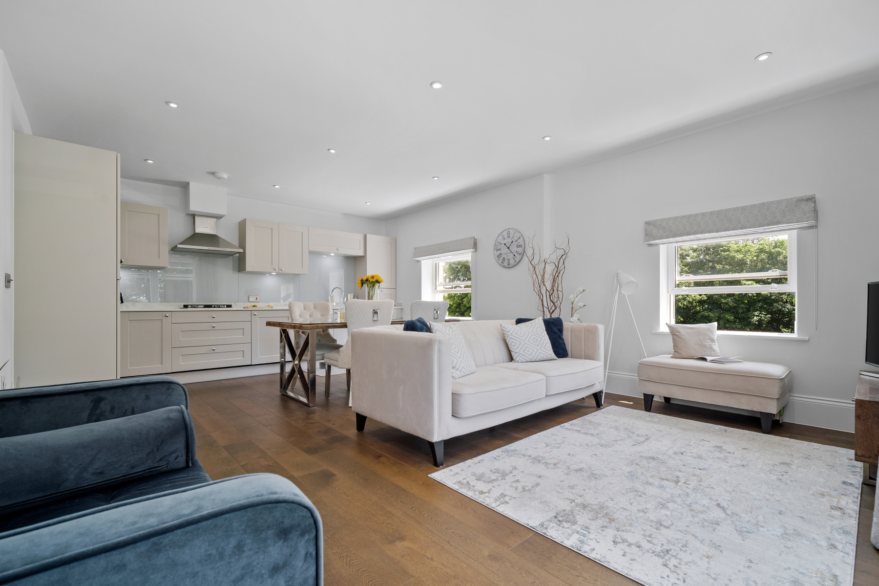 Stepping into the apartment's private entrance, the HALLWAY leads you through to the KITCHEN/LIVING ROOM. This is a glorious room, filled with light and windows open to the views beyond. It has a slick and contemporary feel to it, and the design seems to have been centred around the idea of socialising. The kitchen framing the living space, and the position of furniture invites you to pull up a chair and lean into the table.