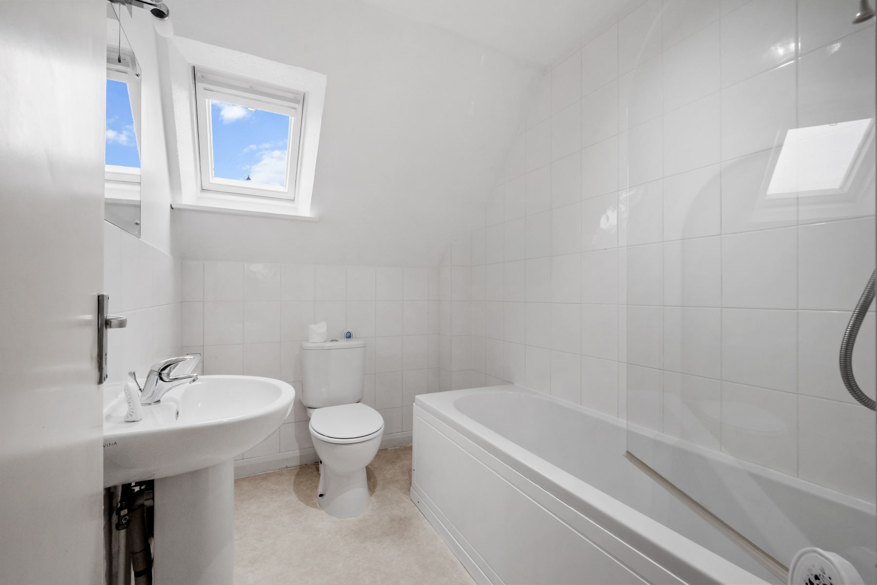There are three DOUBLE BEDROOMS on this floor all offering space and built in cupboards. Each one has a Velux window, a lovely way to stargaze on a clear night. Additionally, there is another large cupboard on the landing for further storage and an airing cupboard.