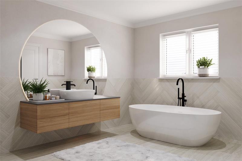 Bathroom equipment, including a freestanding bath, shower enclosure and twin vanity unit to the large family bathroom will be complimented by quality ceramics.