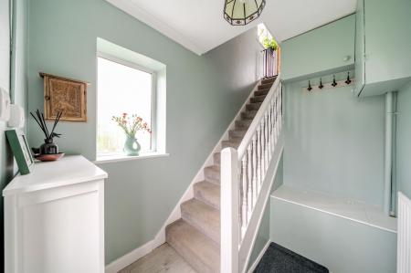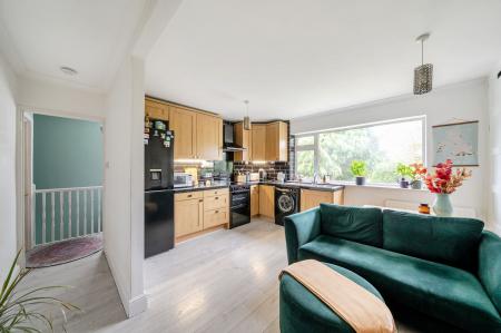 Originally designed as a one-bedroom property, the interior has been thoughtfully reconfigured to offer well-proportioned and versatile accommodation. The entrance leads to stairs rising to the first floor, where there is a comfortable lounge with open-plan kitchen area, together with a storage cupboard housing the boiler. The property also features a double bedroom, a bathroom with window, and an additional room currently used as a guest bedroom/study, which was originally the main bedroom.