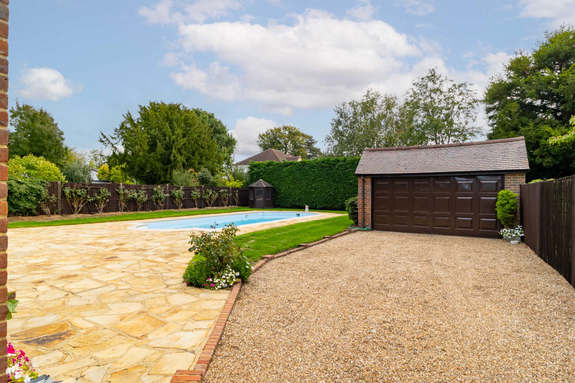The private rear garden, complete with a private swimming pool is perfect for summer entertaining, while the supersized detached garage and generous driveway offer excellent storage and parking.