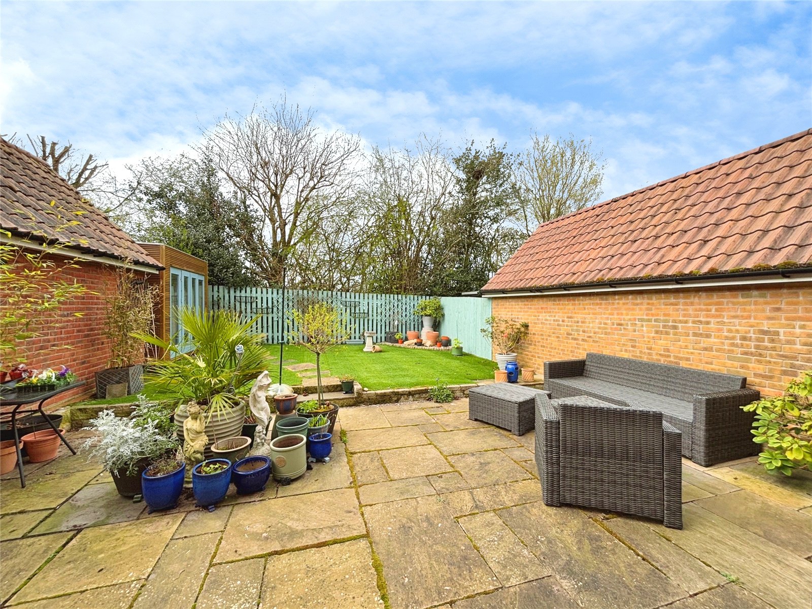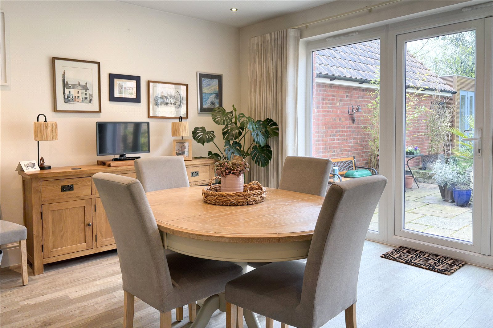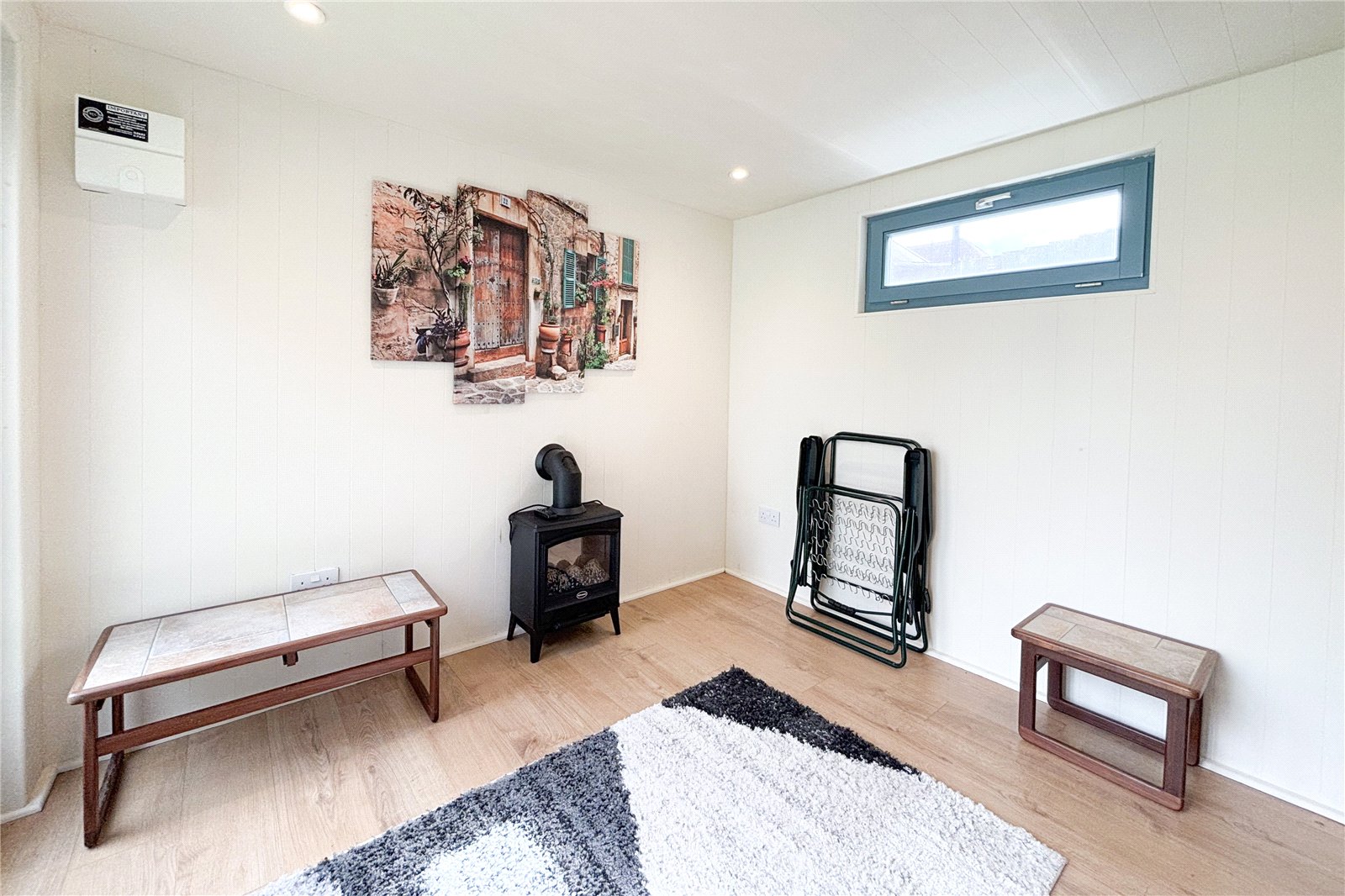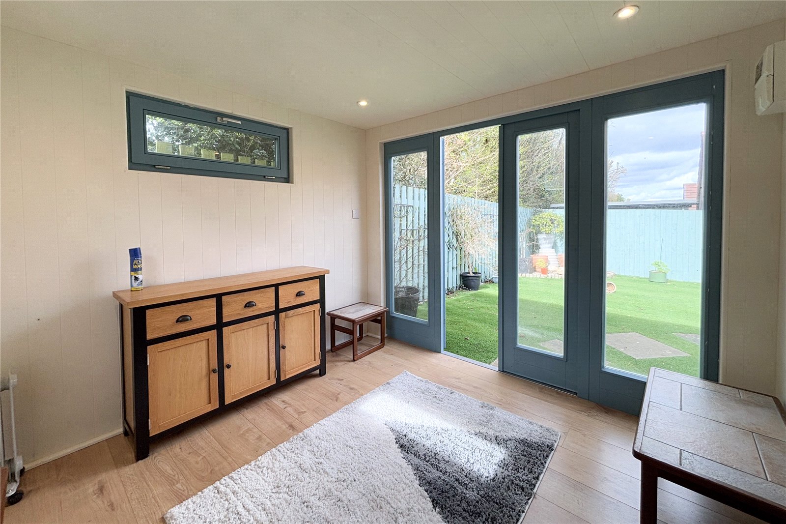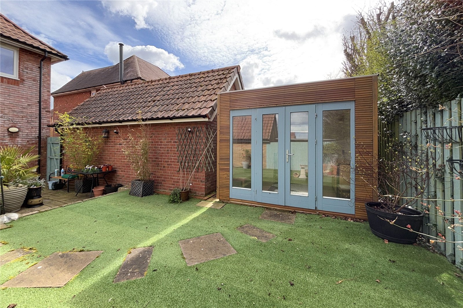 Externally the property features a well-maintained garden with artificial grass allowing for low maintenance year round. An outhouse that includes power and electricity and is an ideal space for a studio or office. To the front is a driveway and garage.