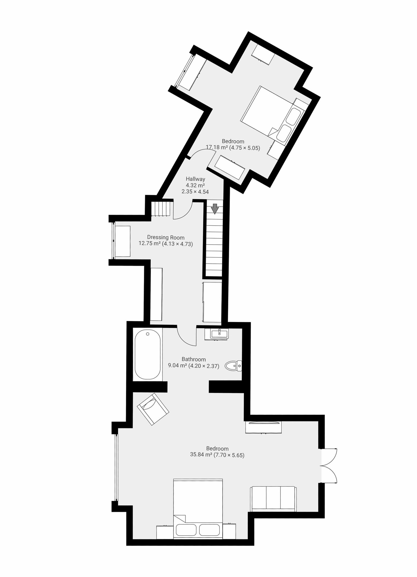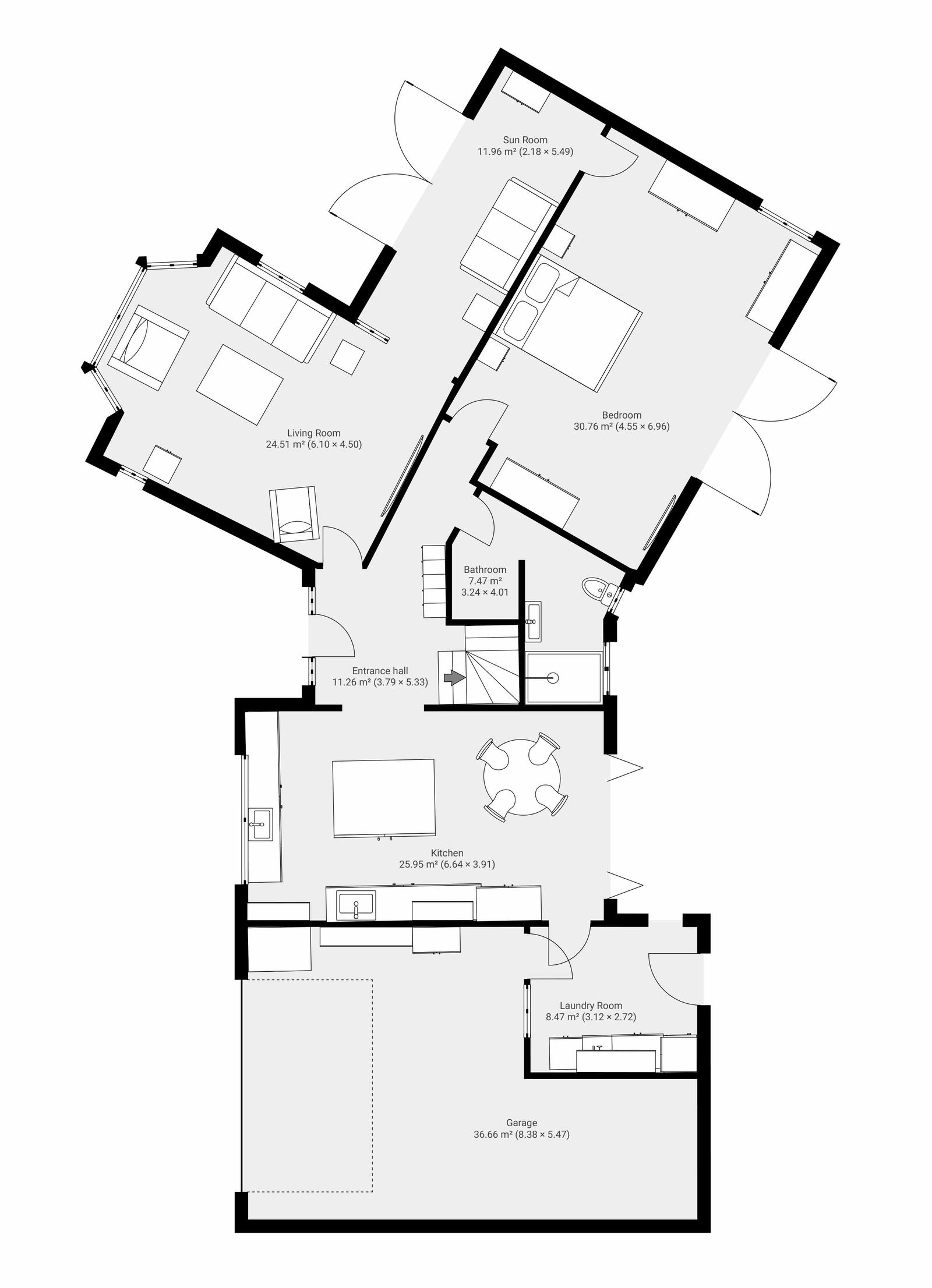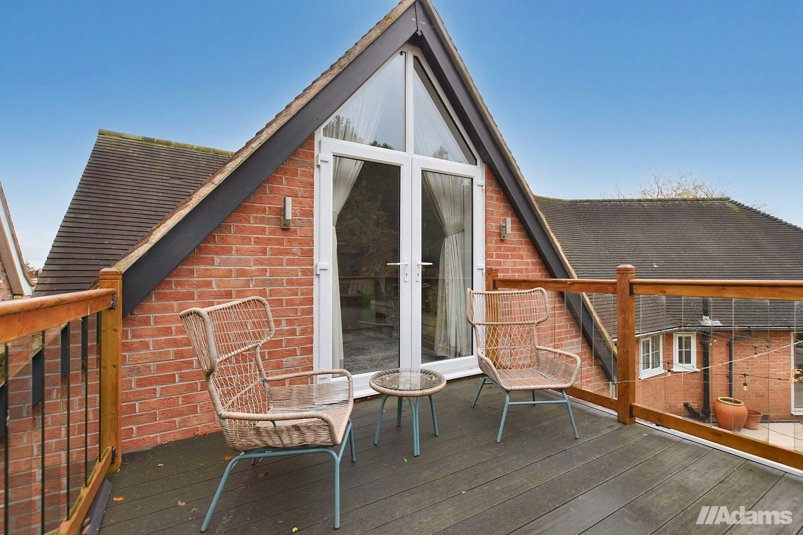 - Ground-floor bedroom with patio doors to outdoor seating area