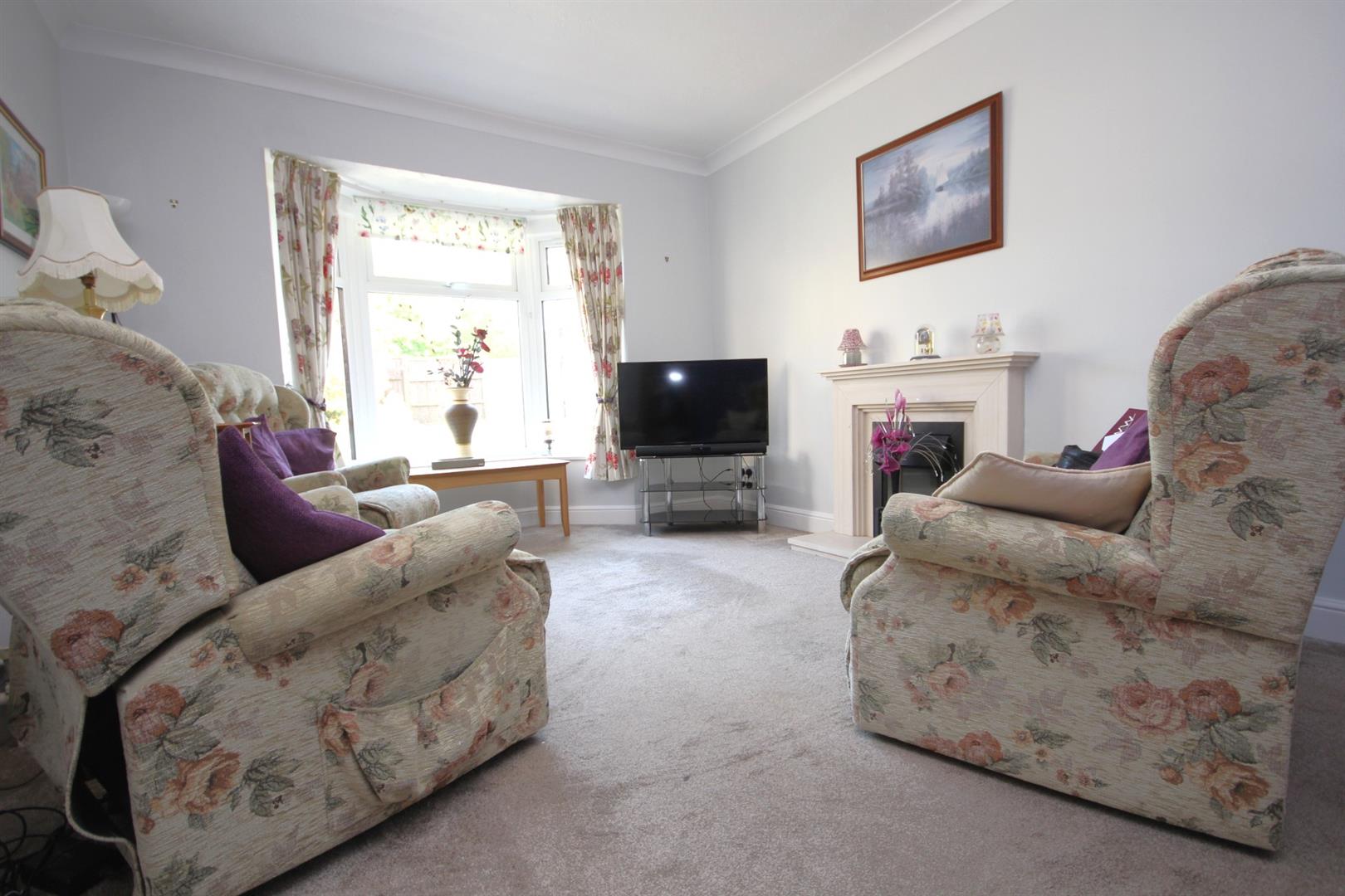Spacious lounge with walk in bay window and centrepiece stone surround fireplace with inset electric fire