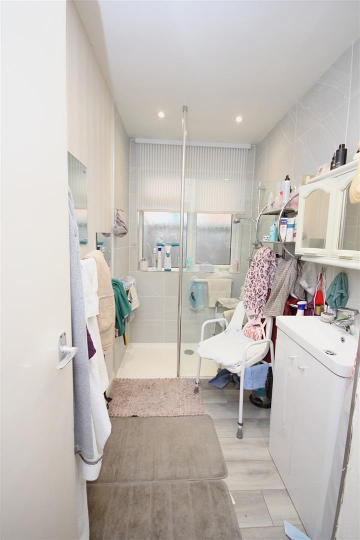 Modern shower room comprising two piece white suite with feature walk in shower & attractive wall tiling