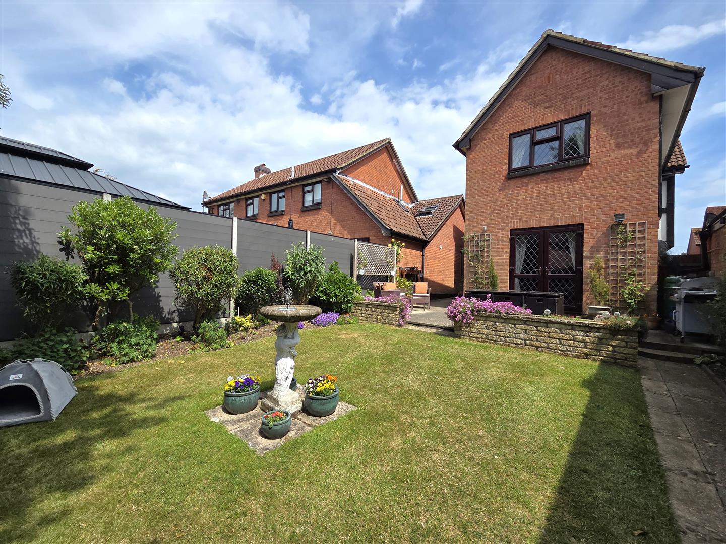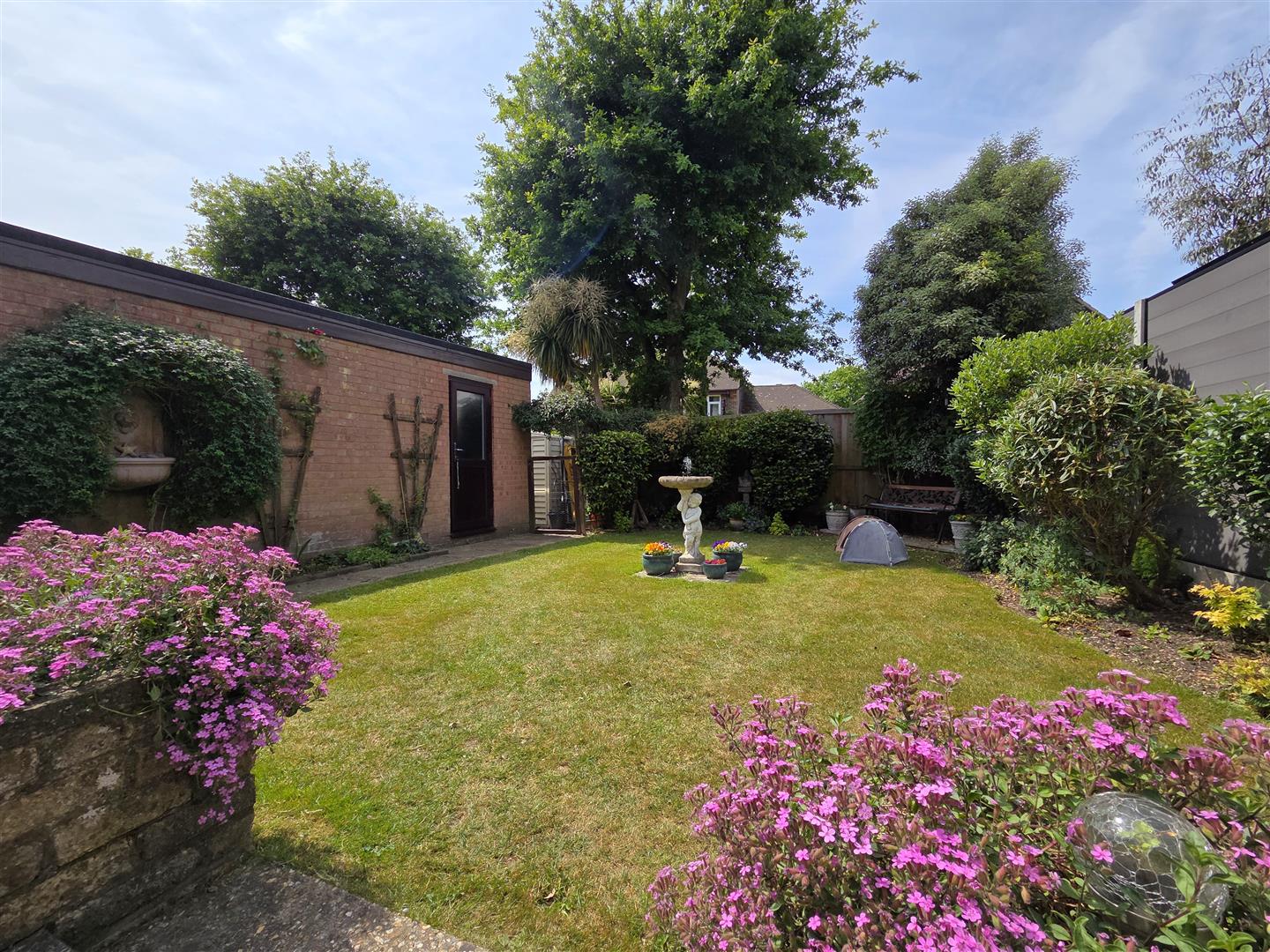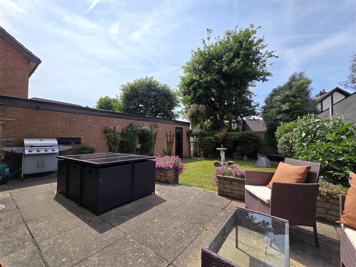 Landscaped garden laid to lawn, paved patio area with display shrubbery/flowers