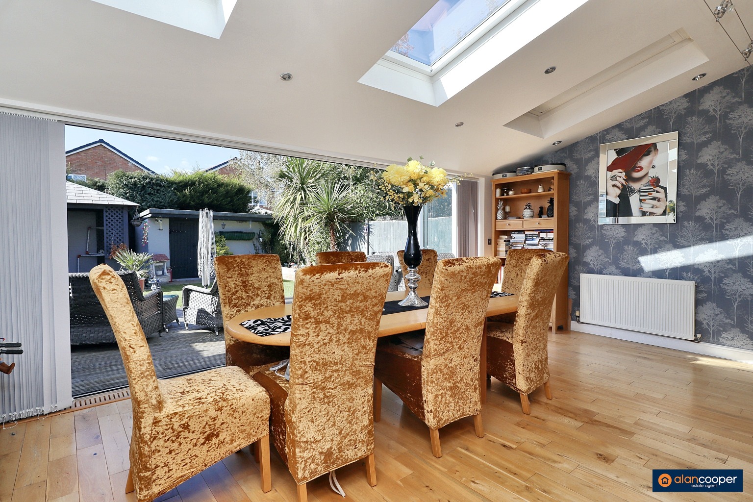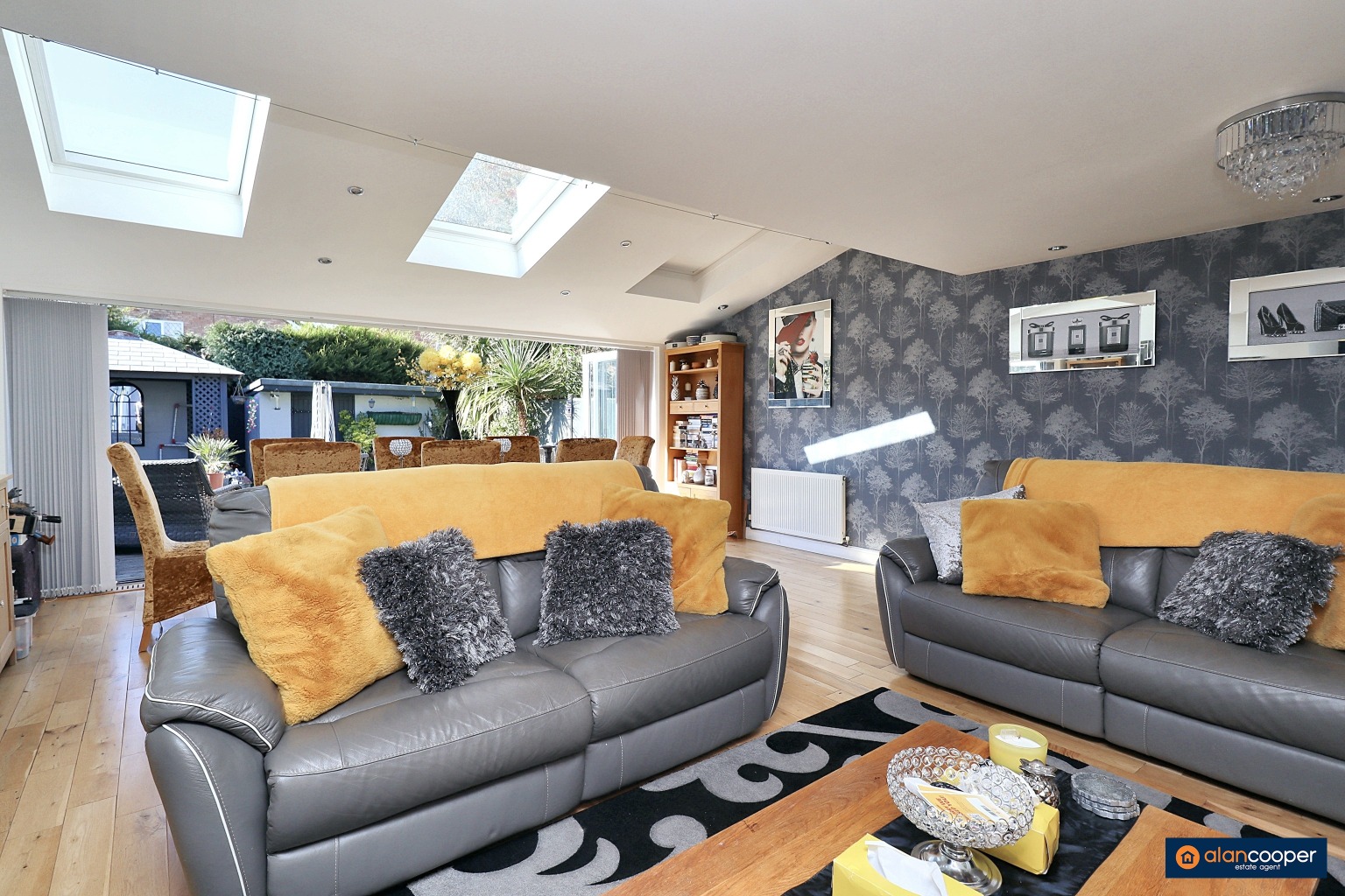 Upon entering, you are greeted by a welcoming reception hall, which includes a convenient guests' cloakroom, a practical addition for any busy household. The heart of the home is undoubtedly the spacious family lounge/dining room, a versatile area perfect for both relaxation and entertaining. This room is enhanced by a feature fireplace, Velux windows that invite natural light, and bi-fold doors that seamlessly open onto the rear garden, creating a wonderful indoor-outdoor flow.