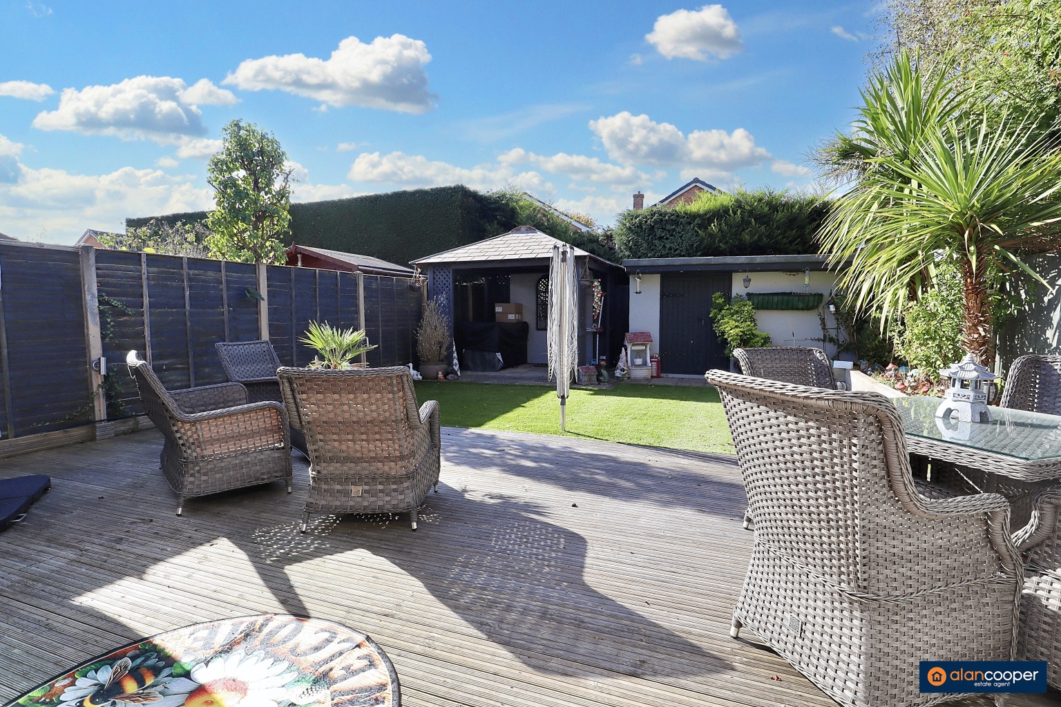 Externally, the property boasts a full-width driveway to the front, providing generous off-road parking. The rear garden is a delightful feature, designed for low maintenance and enjoyment. It includes an attractive decking area, an artificial lawn, and raised floral borders, creating a charming outdoor space. A further patio area to the rear offers an additional spot for al fresco dining or relaxation, and a useful outbuilding provides extra storage or potential for a workshop.