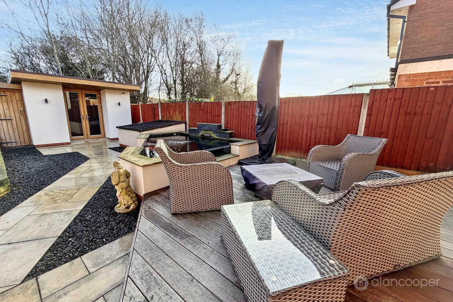 GardenSide pedestrian access leads to the fully enclosed and landscaped rear garden, which is a further highlight of the home, being designed for ease of maintenance with a patio area, decking, artificial lawn, ornamental fishpond and fenced boundaries.