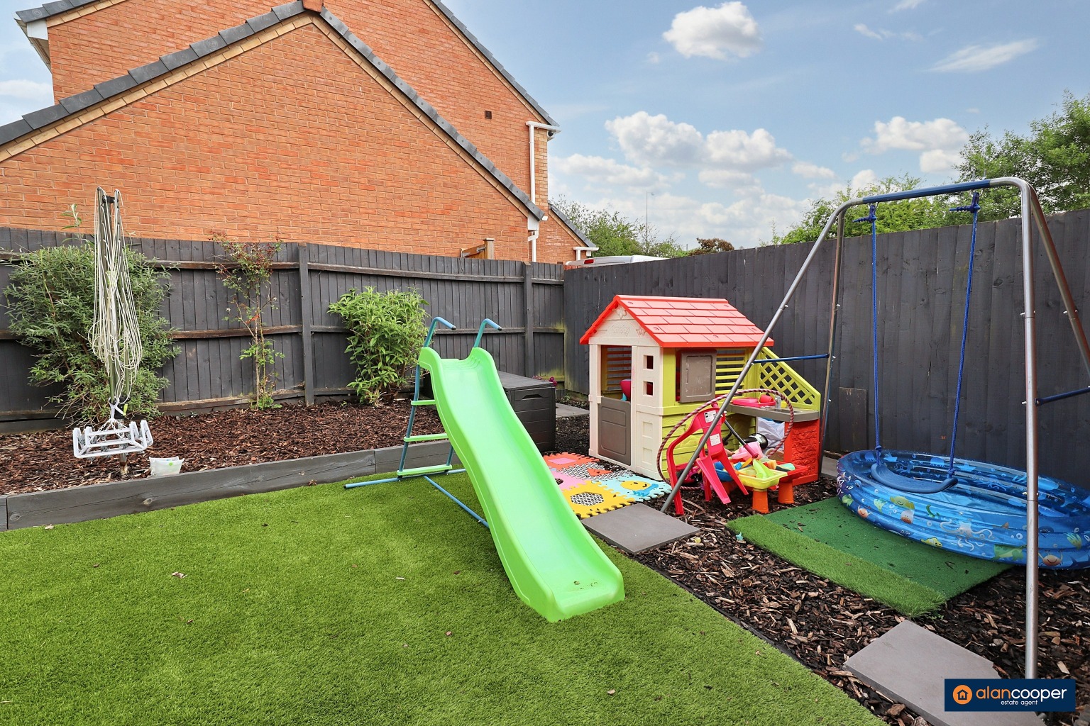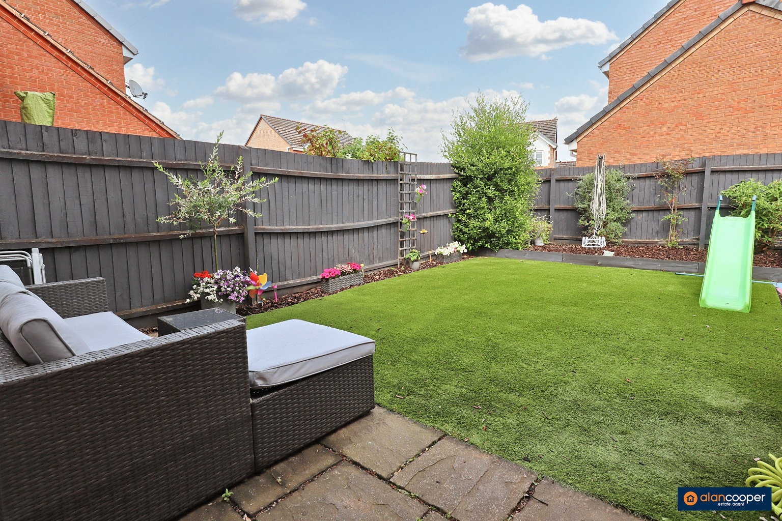GardensHaving a paved patio, artificial lawn, borders with loose bark chippings, fenced boundaries and side access to the garage.