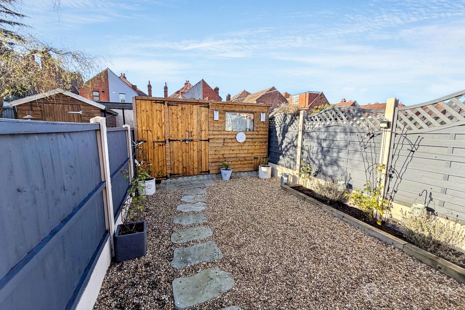 The rear garden has been thoughtfully designed for ease of maintenance, featuring attractive paving and loose stones, creating a pleasant outdoor space for enjoyment without extensive upkeep. Additionally, the garden includes a useful brick outbuilding and a timber shed, providing valuable storage solutions.