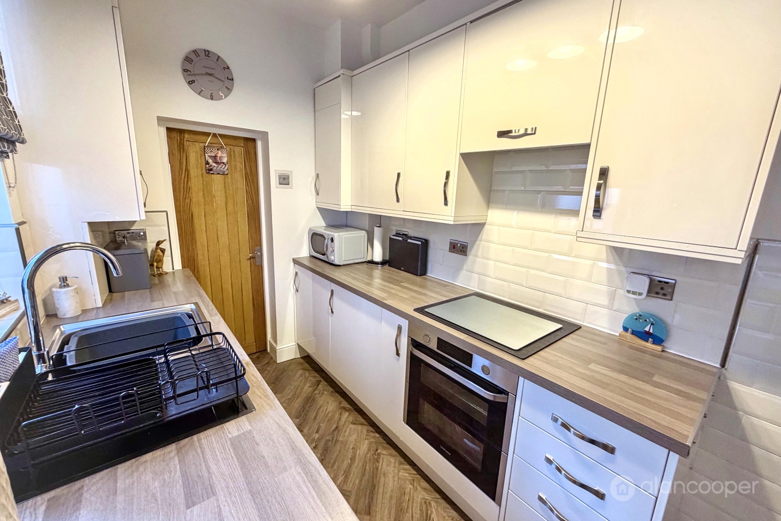 Kitchen6' 3" x 10' 5"Having been refitted by Howden's comprising a stylish and comprehensive range fitted units comprising a single drainer stainless steel sink with hot water mixer tap, fitted base unit, additional base cupboards and drawers with work surfaces over and fitted wall cupboards. Built-in oven, induction hob and extractor hood. Integrated washing machine, fridge and freezer. Central heating radiator, Worcester gas fired boiler fitted in February 2025, UPVC sealed unit double glazed window and stable type composite side entrance door.