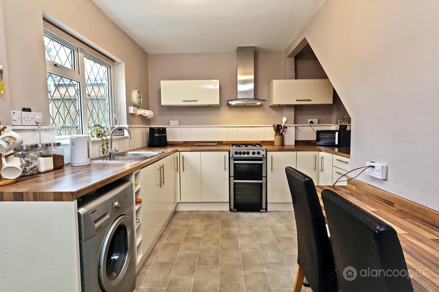 From the lounge, an inner hall provides access to the first-floor staircase and seamlessly transitions into the breakfast kitchen. The kitchen is well-appointed with an inset sink unit, a range of fitted base units, and ample work surfaces, providing practical space for meal preparation. It includes a gas cooker point and plumbing for a washing machine, catering to modern living requirements. A convenient breakfast bar offers a casual eating area, while a radiator ensures comfort. A double-glazed window overlooks the rear garden, offering pleasant views.