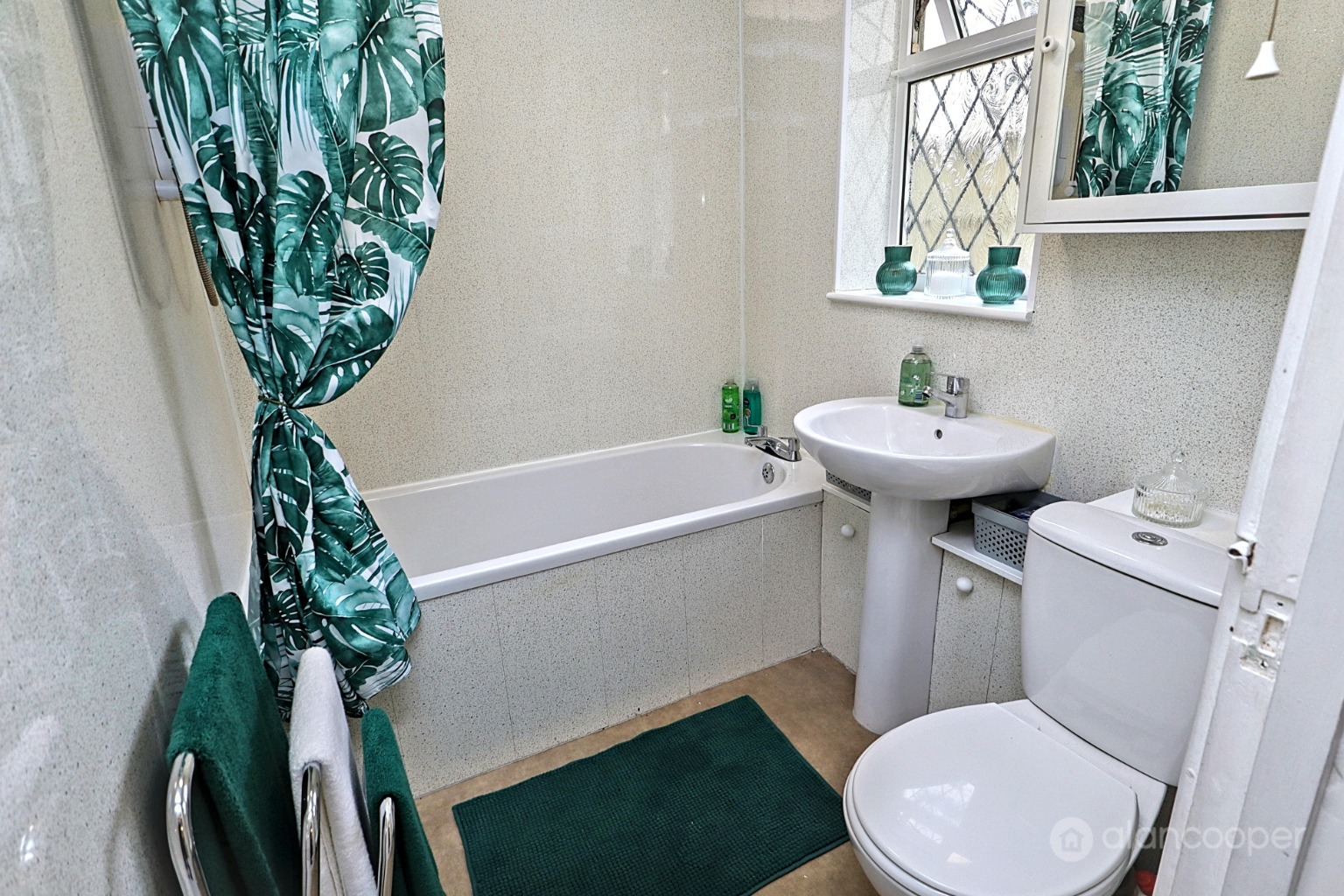 The ground floor is completed by the family bathroom, which comprises a white suite including a panelled bath, a pedestal wash hand basin, and a low-level WC. A double-glazed window ensures natural ventilation and light.