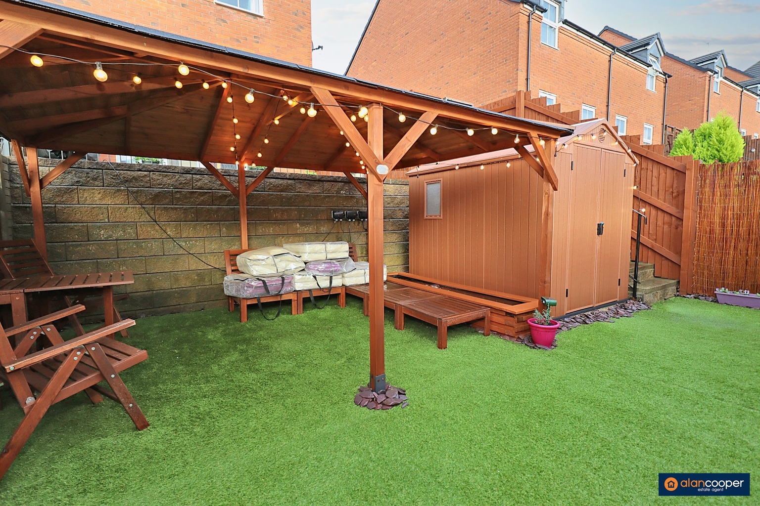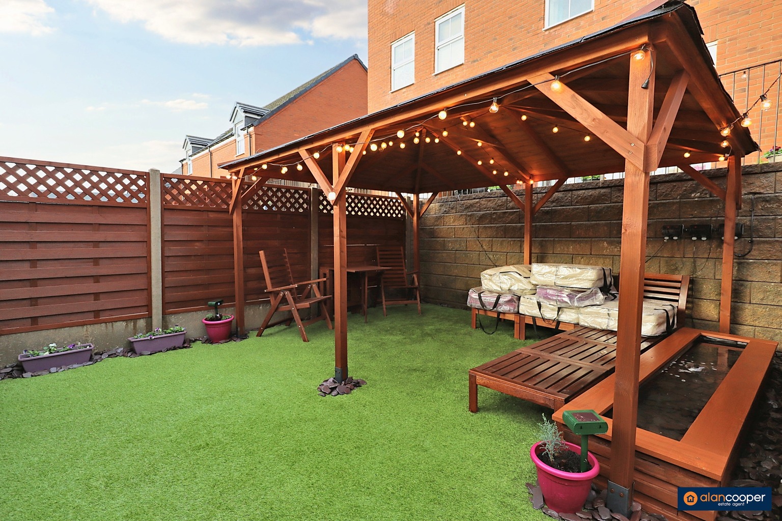 Externally, the property benefits from a driveway located to the side of the house, providing convenient off-road parking. The rear garden is a particular highlight, featuring a paved balcony area with steps leading down to an artificial lawn and a covered seating area. This low maintenance garden provides an ideal space for relaxation, outdoor dining, and entertaining throughout the year, complete with outdoor power sockets.