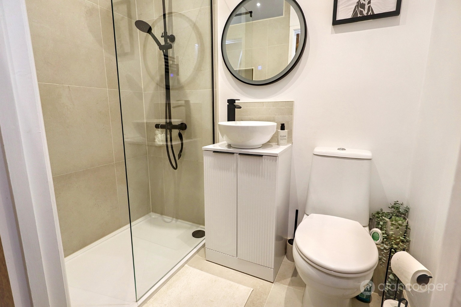 The breakfast kitchen is a true highlight, equipped with an inset sink unit, a built-in oven, hob, and extractor fan, along with an integrated dishwasher. There is plumbing for a washing machine and ample space for a tumble dryer and a fridge freezer. Feature island/breakfast area, stylish vertical radiator, two double glazed windows, and a double glazed door leading to the rear garden complete this functional and attractive space. For added convenience, a guests' cloakroom on the ground floor features a white suite comprising a pedestal wash hand basin and a low-level WC, a double glazed window, and an extractor fan.