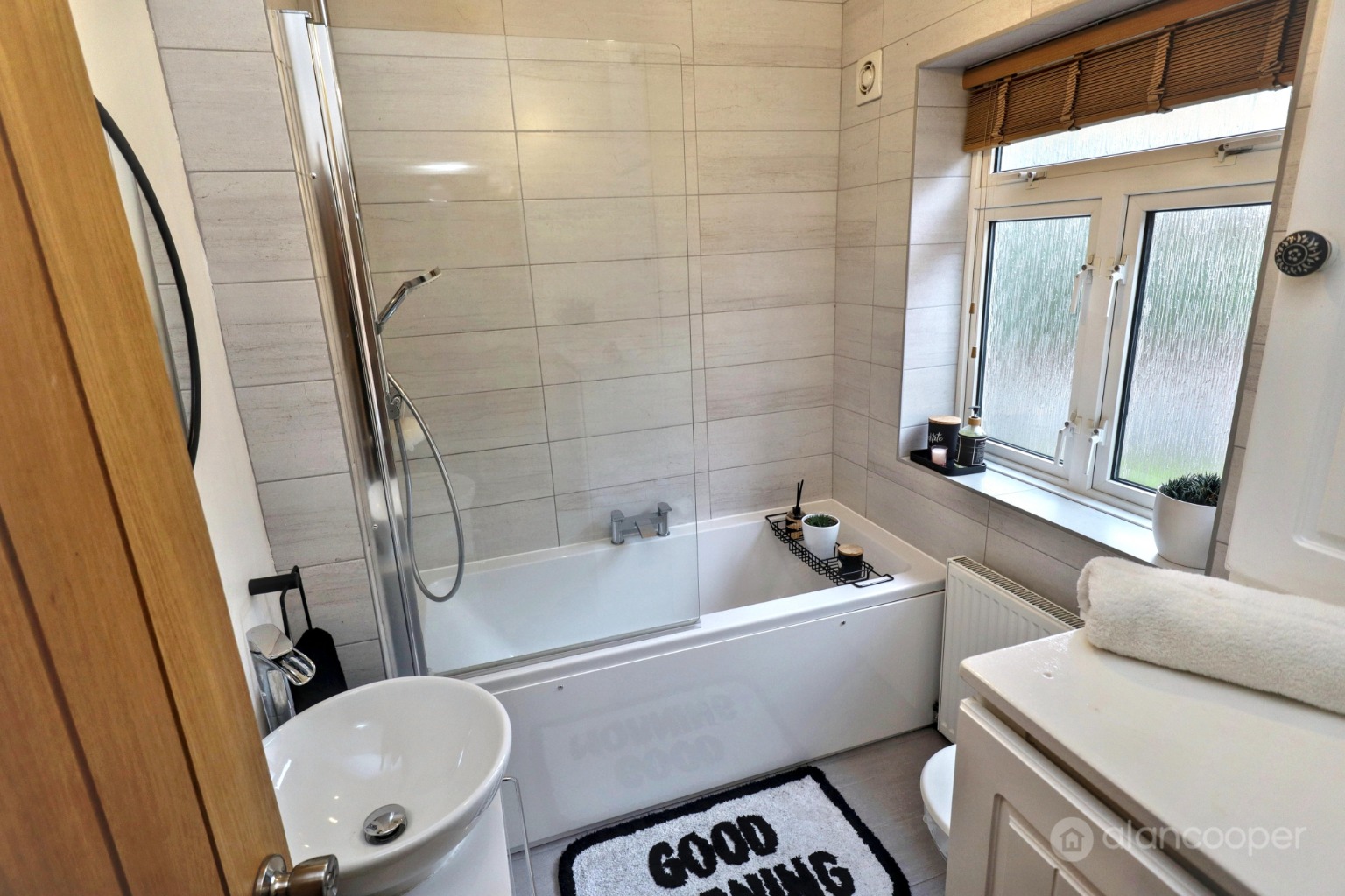 Ascending to the first floor, the landing benefits from a double glazed window and provides access to the loft. The main bedroom, located at the rear of the property, is a generous space featuring fitted wardrobes, a radiator, and a double glazed window. This bedroom also benefits from a modern en-suite, which has been fitted to a high-standard to include a walk-in shower, a wash hand basin, a low-level WC, a heated towel rail, and an extractor fan. Bedroom two is a comfortable room with a radiator and a double glazed bay window to the front, while bedroom three offers a radiator and a double glazed window. Bedroom four is also well-proportioned, featuring a radiator and two double glazed windows. The family bathroom serves the remaining bedrooms and comprises a bath, a wash hand basin, a low-level WC, a radiator, and a double glazed window.