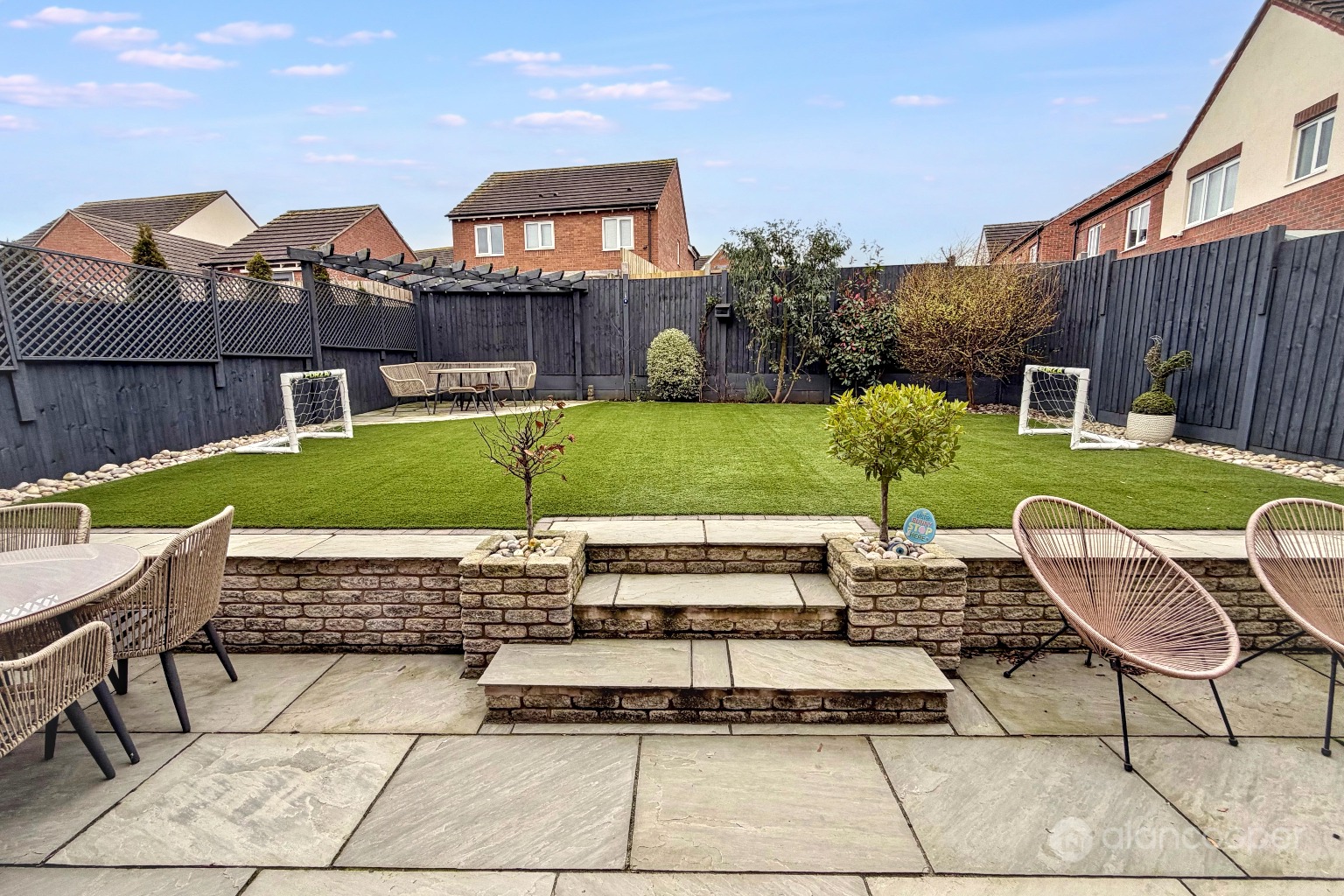 Externally, the property features a full-width driveway providing ample parking for multiple vehicles. The rear garden has been thoughtfully landscaped for ease of maintenance, incorporating a pleasant patio area perfect for outdoor dining and an artificial lawn, ensuring a green space all year round without the upkeep.