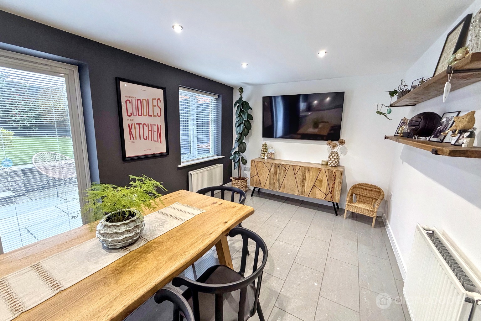 The heart of the home is the spacious open plan family dining kitchen, which boasts a stylish and comprehensive range of fitted units, a built-in oven and hob, an integrated dishwasher and fridge freezer. Windows and glazed doors open directly onto the garden, seamlessly blending indoor and outdoor living.
