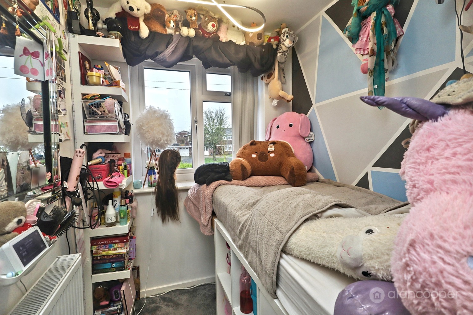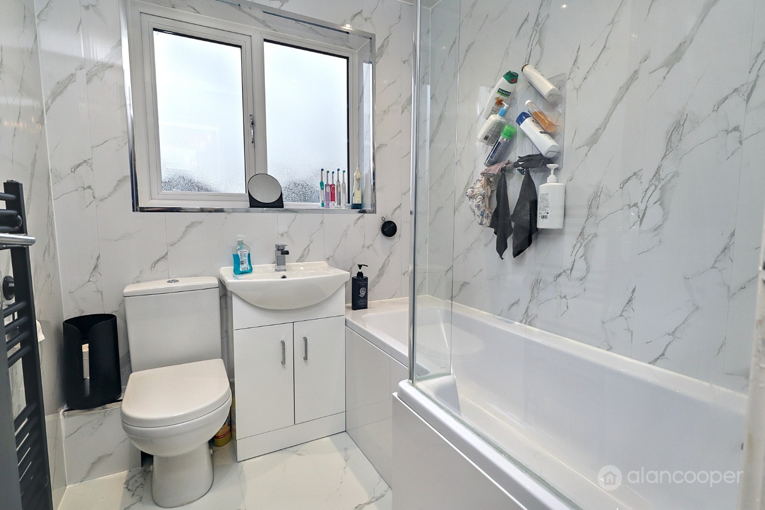 Ascending to the first floor, the landing provides access to an airing cupboard, a double-glazed window, and loft access. The main bedroom is generously proportioned and includes a useful storage wardrobe, alongside a window offering pleasant views. The second bedroom also benefits from a built-in wardrobe and a window, while the third bedroom features a storage cupboard and a window, ensuring ample storage for all residents. The modern family bathroom completes the first floor, fitted with a stylish white suite that includes a bath with a shower over, a pedestal wash hand basin, and a low-level WC. An obscure window to the rear elevation ensures privacy.