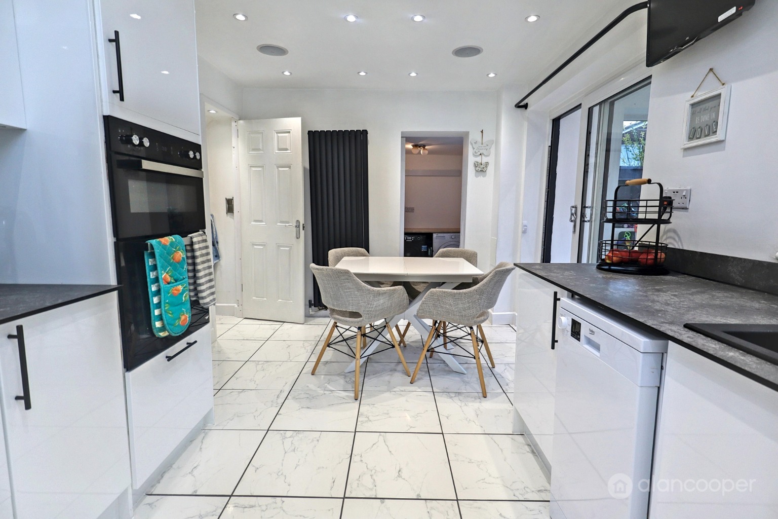 Upon entering, a welcoming front entrance hall and leads directly into the inviting lounge. This comfortable space features elegant panelling on a feature wall, creating a sophisticated focal point, and is bathed in natural light from a double-glazed window overlooking the front aspect. The seamless flow of the ground floor guides you into the heart of the home, the modern dining kitchen.
