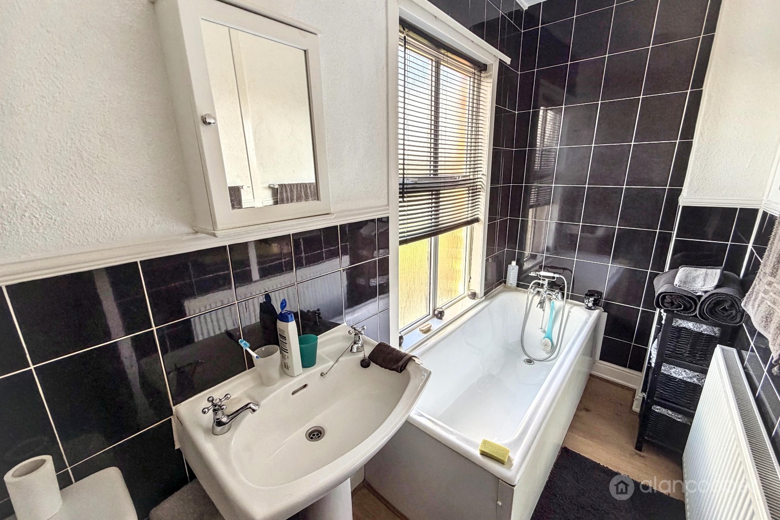 Family BathroomBeing half tiled to the walls and having a white suite comprising a panelled bath with mixer tap and shower attachment, pedestal wash hand basin and low-level WC. Central heating radiator and sealed unit double glazed window