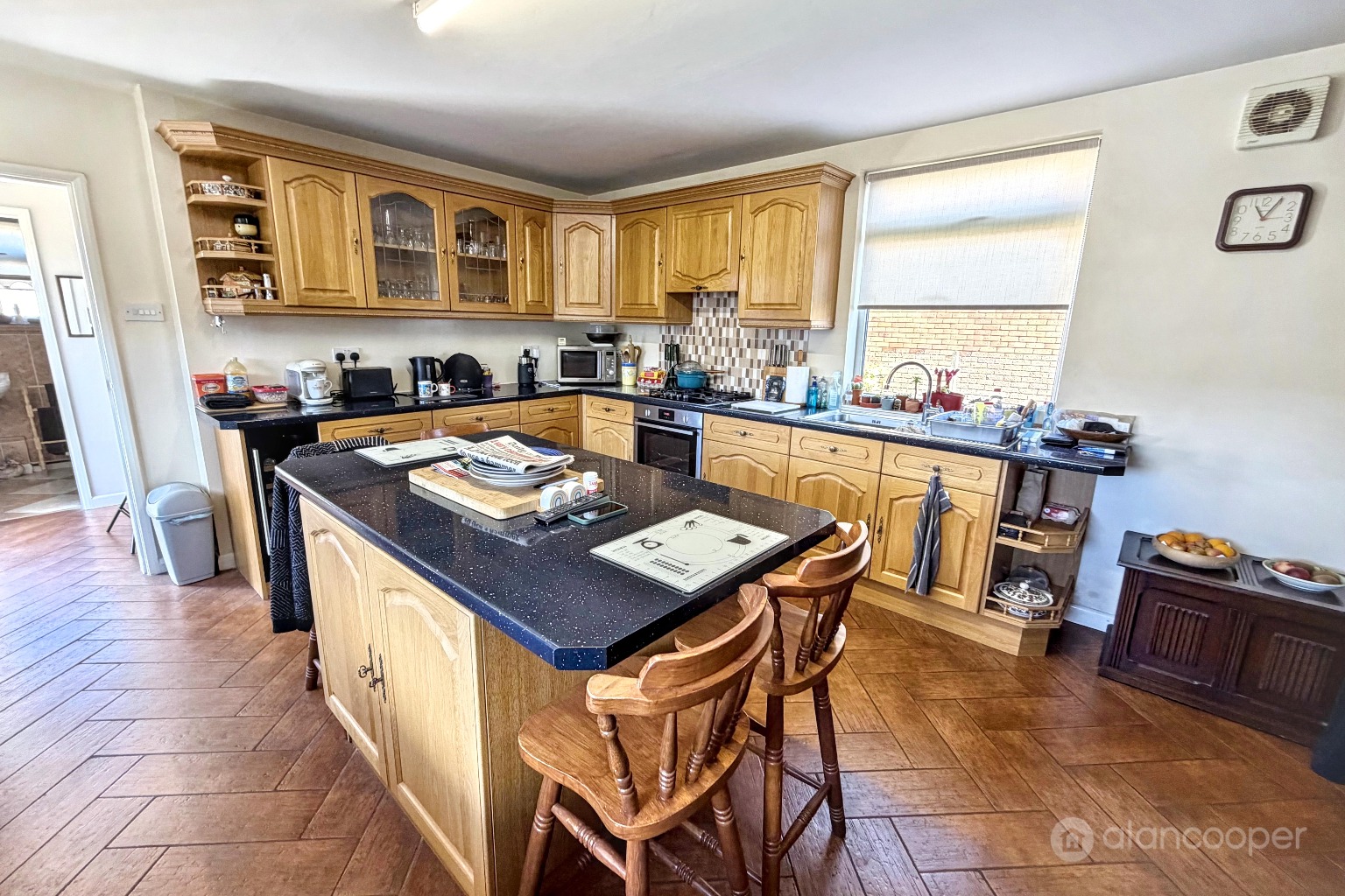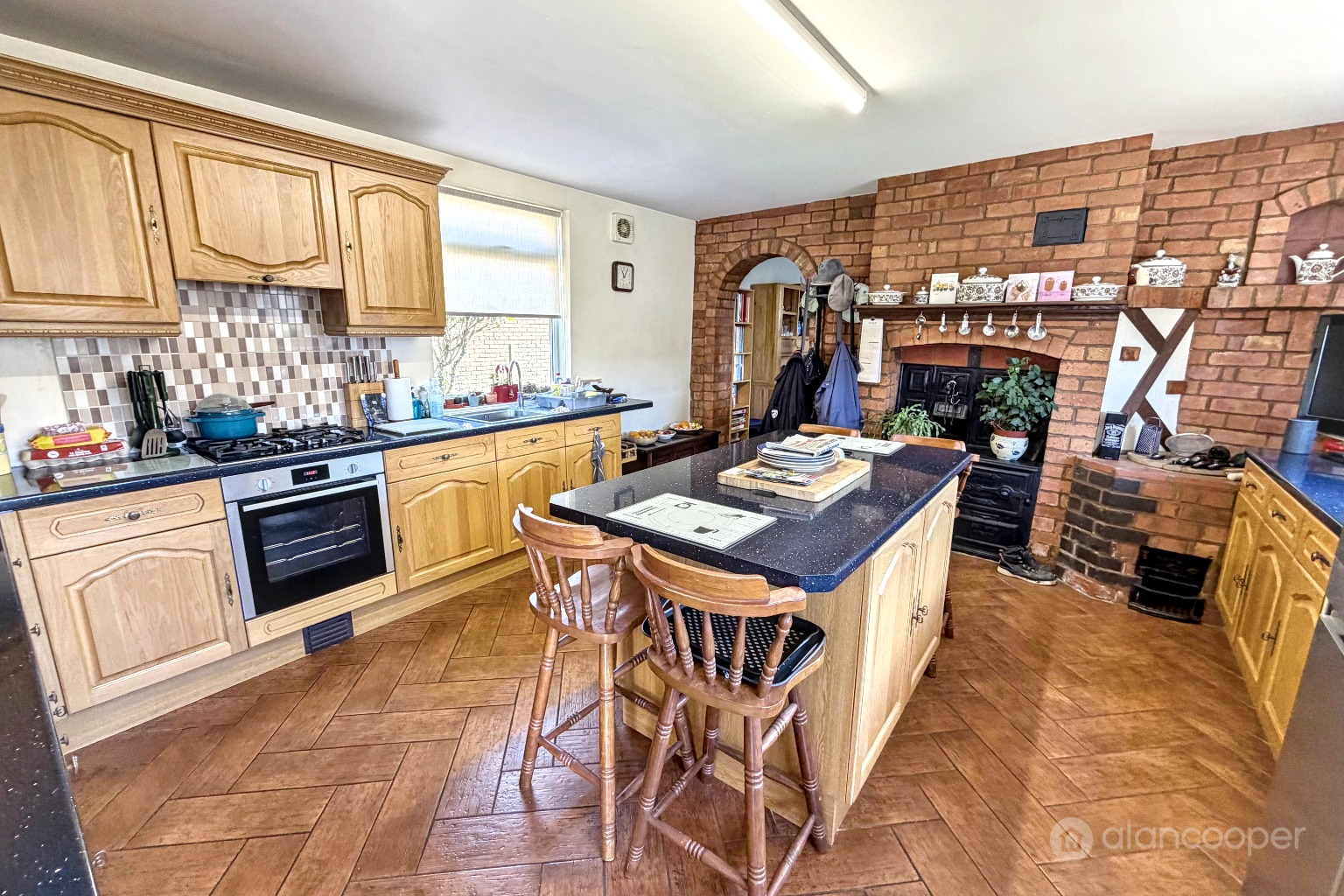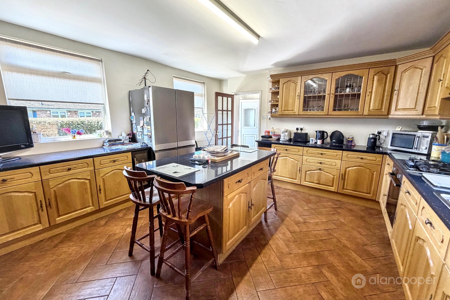 Further enhancing the ground floor's versatility is a separate dining room, complete with an antique-style ornamental fireplace and a side window. An archway from here leads into the spacious breakfast kitchen, a true heart of the home, featuring a central island and three dual aspect windows that flood the space with natural light. Off the kitchen, a rear entrance lobby provides access to a useful utility room and a convenient combined shower room/guests' cloakroom, adding practicality to daily living.