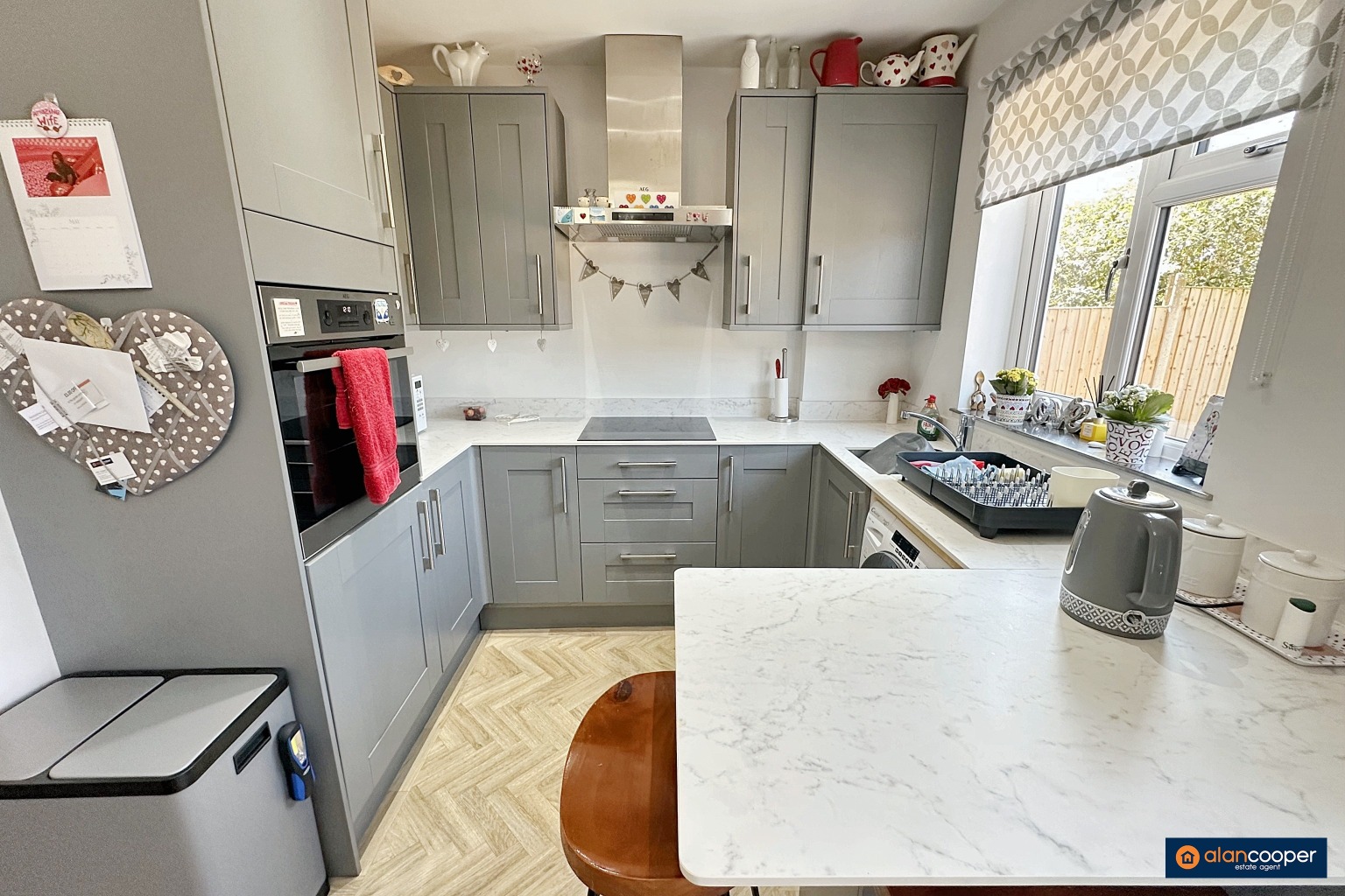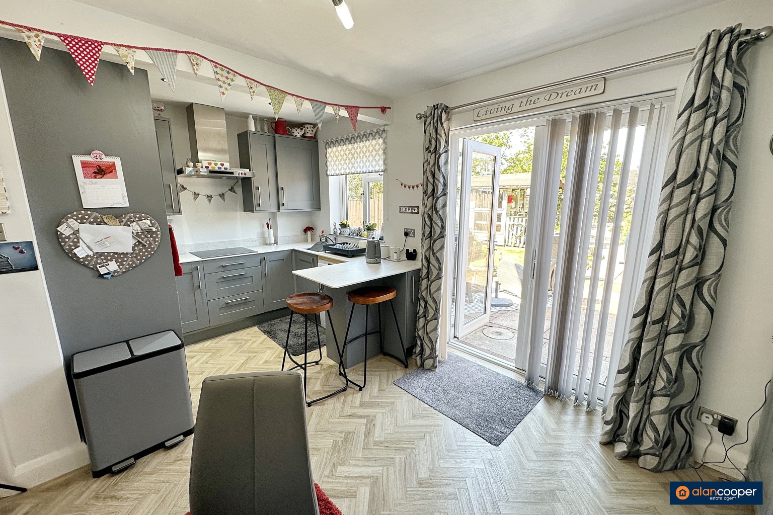 Dining Kitchen16' 2" x 12' 0" reducing to 8' 7"The open plan dining kitchen is considered the heart of the home, having a comprehensive range of fitted units, comprising an inset sink with mixer tap, fitted base unit, additional base cupboards and drawers with work surfaces over, breakfast bar and fitted wall cupboards. Built-in oven, hob and extractor hood. Central heating radiator, gas fired boiler, cupboard under the staircase, UPVC sealed unit double glazed window and double doors leading to the rear garden.