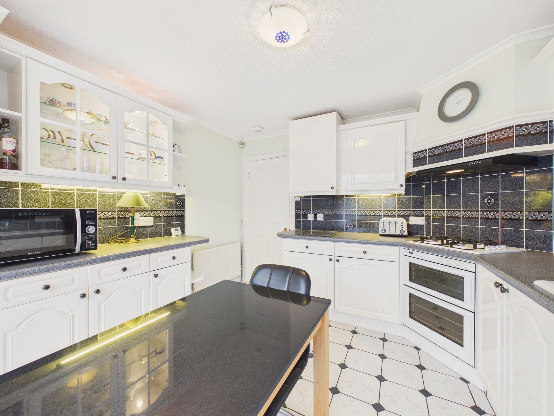 The dining kitchen is well appointed with built-in cooking appliances and ample storage and worktop space. A sliding patio door opens directly into the conservatory, which enjoys pleasant views over the garden and provides a versatile additional reception space. A further door from the conservatory allows direct access to the rear garden, making this area ideal for enjoying the warmer months.