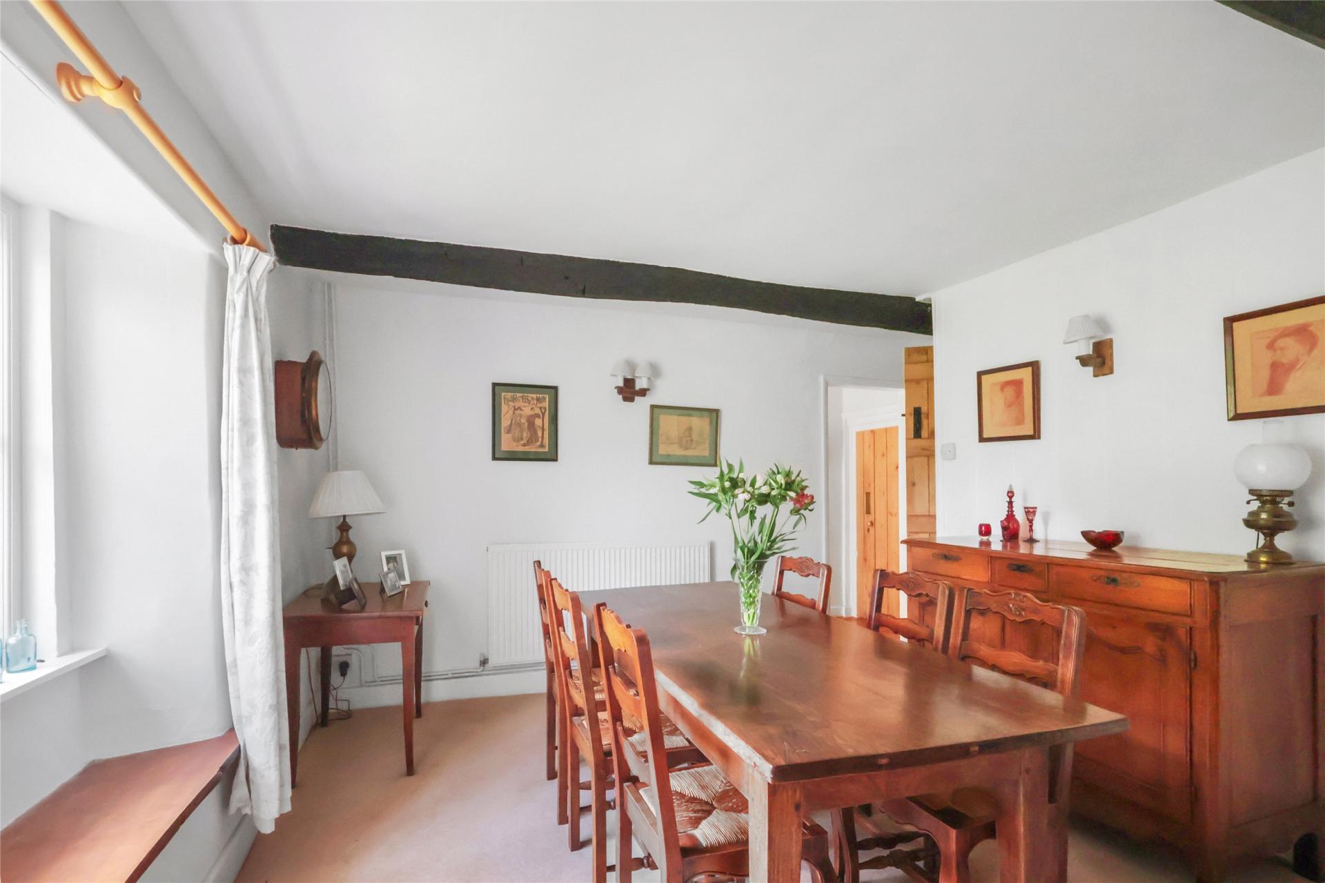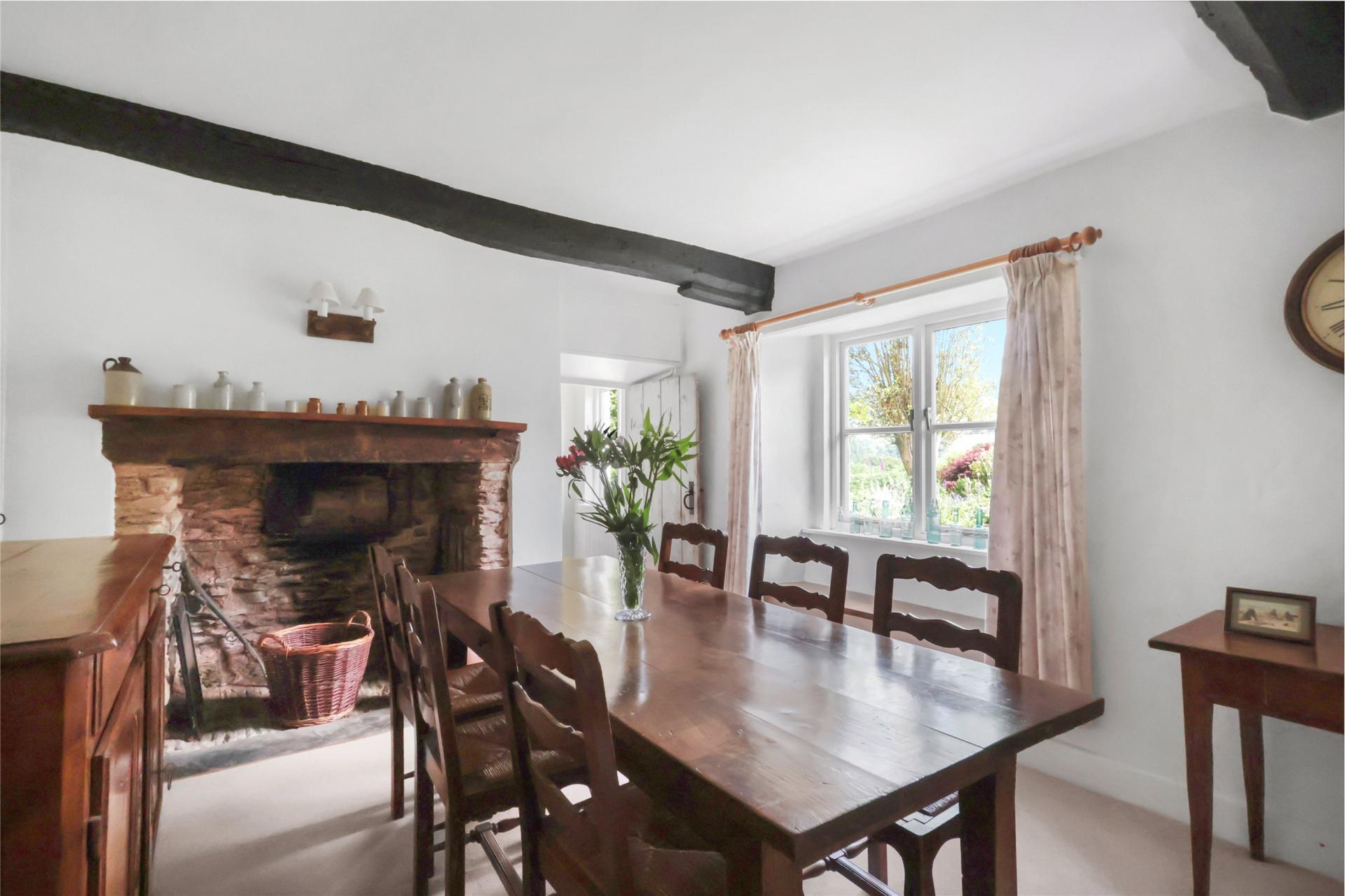 A quaint entrance lobby with tiled flooring flowing into a welcoming reception hall, setting the tone for the rest of this characterful home. The sitting room is a comfortable space with a fireplace and Jotul woodburner on flag stone hearth, exposed beams, and double-glazed French doors opening directly to the terrace and gardens. A formal dining room is equally charming, featuring a stone fireplace with a bread oven and flag stone hearth, exposed ceiling beams, and a deep window seat.