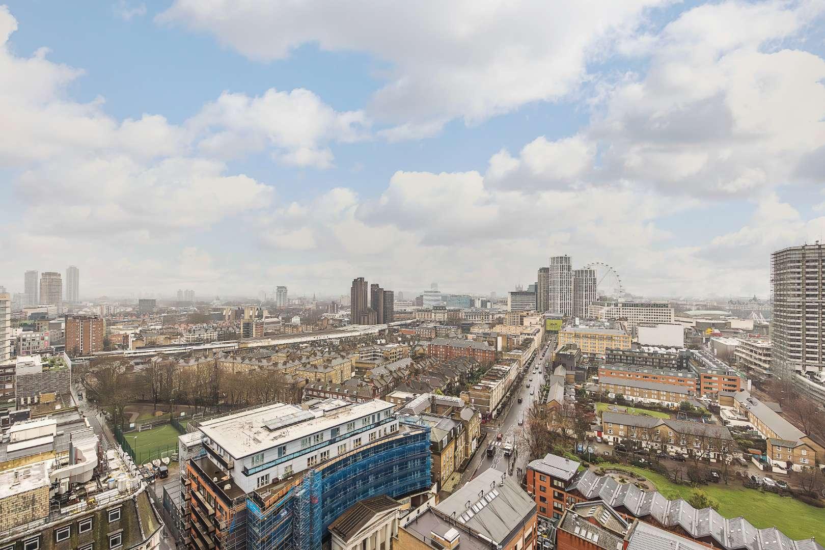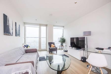 The apartment boasts floor-to-ceiling windows, flooding the space with natural light and offering views of the iconic London skyline. The interior features a stylish, open-plan layout, with high-quality finishes and a contemporary aesthetic throughout. The living area provides an ideal environment for both relaxation and entertaining.