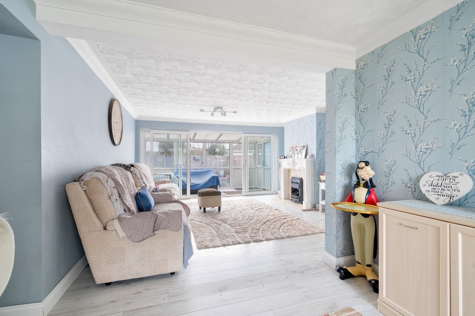 The living room, located at the rear of the house, offers a serene retreat, perfect for relaxation or entertaining guests. Its thoughtful design ensures a bright and inviting atmosphere. At the rear of the property it is not overlooked, and the greenery opposite is protected land that cannot be built on, giving the home a more open, spacious feel and enhancing its sense of privacy.