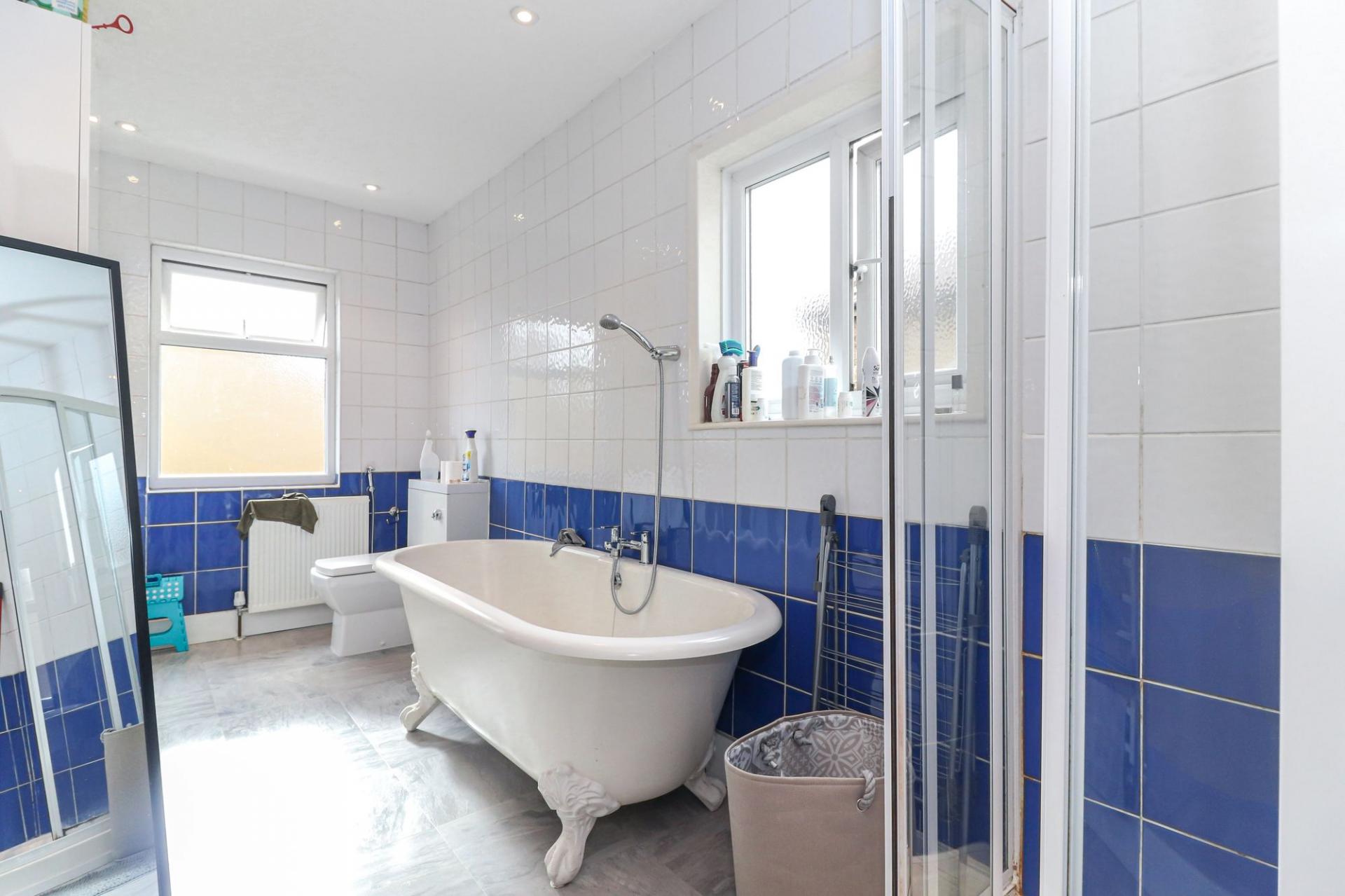 Upstairs, there are two well-proportioned bedrooms and a modern family bathroom fitted with a freestanding claw-foot bath and a separate shower enclosure.